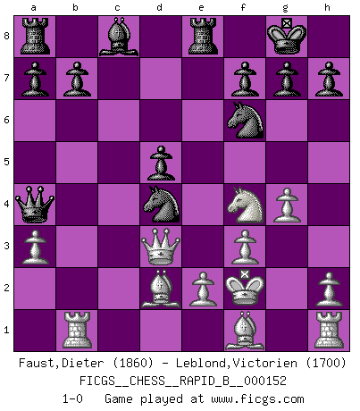 Last move : 1-0 2010 August 10 10:29:17 [Event "FICGS__CHESS__RAPID_B__000152"] [Site "FICGS"] [Date "2010.06.17"] [Round "1"] [White "Faust,Dieter"] [Black "Leblond,Victorien"] [Result "1-0"] [WhiteElo "1860"] [BlackElo "1700"] 1.d4 Nf6 2.c4 e6 3.Nc3 Bb4 4.a3 Bxc3+ 5.bxc3 O-O 6.f3 d5 7.Nh3 c5 8.cxd5 exd5 9.Nf4 Re8 10.g4 Nc6 11.Qd3 Qa5 12.Bd2 Qa4 13.Kf2 cxd4 14.cxd4 Nxd4 15.Rb1 1-0 This chess game has been lost on time (started : 2010.06.17 10:26:57) Nimzo-Indian : Saemisch variation Kingside Castling by player Black (move 5) Player White won this chess game. Follow this game move after move (download)The Pawns are the soul of the game. (Francois Andre Danican Philidor) Ich möchte Schüler heranbilden, die das Vermögen haben, selbst zu denken und Kritik zu üben. (Emanuel Lasker) Repentinamente, me resultaba obvio en mi analisis que yo había pasado por alto lo que Fischer había visto en el tablero con la mas grande facilidad. (Mikhail Botvinnik) Un footballeur joue avec ses pieds, parfois avec sa tête. Un joueur d'échecs ne joue qu'avec sa tête. Et quand il ne joue plus, il meurt. (Jacob Murray) A person who never made a mistake never tried anything new. (Albert Einstein)