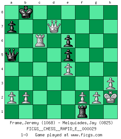 Last move : 1-0 2010 July 5 2:37:10 [Event "FICGS__CHESS__RAPID_E__000029"] [Site "FICGS"] [Date "2010.06.17"] [Round "1"] [White "Frame,Jeremy"] [Black "Melquiades,Jay"] [Result "1-0"] [WhiteElo "1068"] [BlackElo "0825"] 1.e4 e5 2.Nf3 d6 3.Bc4 Be6 4.Bxe6 fxe6 5.d4 Nc6 6.dxe5 Nge7 7.exd6 cxd6 8.Nc3 Qa5 9.O-O O-O-O 10.Bd2 h5 11.h3 Ne5 12.Nxe5 dxe5 13.Qe2 Nc6 14.Rad1 Bb4 15.Bg5 Be7 16.Bxe7 Nxe7 17.Rxd8+ Rxd8 18.Qxh5 Nc6 19.Qf7 Nd4 20.Qxg7 Nxc2 21.Rc1 Nd4 22.Nd5 Nc6 23.Ne7+ Kb8 24.Nxc6+ bxc6 25.Rxc6 Rd1+ 26.Kh2 Rf1 27.Qd7 1-0 Philidor's defense Kingside Castling by player White (move 9) Queenside Castling by player Black (move 9) Player White won this chess game. Follow this game move after move (download)Strategy requires thought, tactics require observation. (Max Euwe) Irgendwie scheint mir sonntags früh um 9 Uhr der Killerinstinkt verloren gegangen zu sein. (Alexej Shirov) El Ajedrez es en su esencia, un juego. En su forma, un arte. Y en su ejecución, una ciencia. (Baron Tassilo) Tout change constamment, y compris dans le monde des Echecs. (Botvinnik) If everyone is thinking alike, then somebody isn't thinking. (US General George S. Patton)