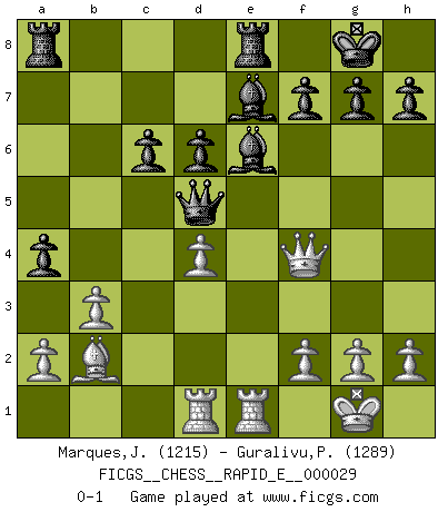 Last move : 0-1 2010 July 19 14:51:12 [Event "FICGS__CHESS__RAPID_E__000029"] [Site "FICGS"] [Date "2010.06.17"] [Round "1"] [White "Marques,Joao"] [Black "Guralivu,Paul-Iosif"] [Result "0-1"] [WhiteElo "1215"] [BlackElo "1289"] 1.e4 c5 2.Nf3 d6 3.d4 cxd4 4.Nxd4 Nf6 5.Nc3 e5 6.Be2 exd4 7.Nd5 Nxd5 8.exd5 Qa5+ 9.Qd2 Qxd5 10.O-O Nc6 11.c3 Be7 12.Bf3 Qc4 13.Bxc6+ bxc6 14.Re1 Be6 15.cxd4 O-O 16.b3 Qd5 17.Bb2 Rfe8 18.Qf4 a5 19.Rad1 a4 0-1 Sicilian Kingside Castling by player White (move 10) Kingside Castling by player Black (move 15) Player Black won this chess game. Follow this game move after move (download)Chess is mental torture. (Garry Kasparov) Mein Name ist Rustam Kamsky. Sie haben meinen Sohn belästigt. Bereiten Sie sich aufs Sterben vor. (Rustam Kamsky) El Ajedrez hace al hombre ser mas sabio y ver mas claro. (Vladimir Putin) D'abord les bases : Jouez et étudiez, puis étudiez et jouez, ensuite jouez et étudiez, puis étudiez et jouez. Deuxièmement : Donnez toujours le meilleur de vous-même ! (Ken Smith) Optimism is a variety of information deficit. Sometimes especially true for correspondence chess games. (Michael Aigner)