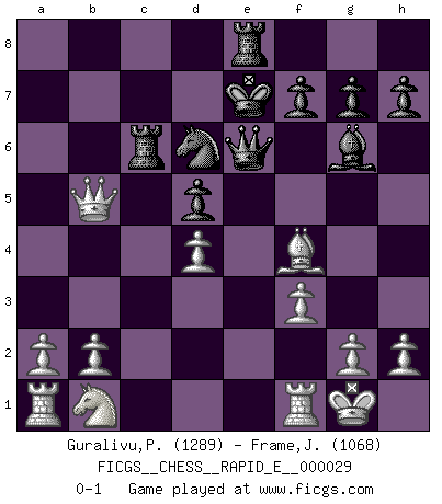 Last move : 0-1 2010 July 25 22:6:14 [Event "FICGS__CHESS__RAPID_E__000029"] [Site "FICGS"] [Date "2010.06.17"] [Round "1"] [White "Guralivu,Paul-Iosif"] [Black "Frame,Jeremy"] [Result "0-1"] [WhiteElo "1289"] [BlackElo "1068"] 1.e4 e5 2.Nf3 Nf6 3.Nxe5 d6 4.Nf3 Nxe4 5.d4 d5 6.c4 c6 7.Bd3 Bf5 8.O-O Bg6 9.cxd5 cxd5 10.Qb3 b6 11.Ne5 Be7 12.Bb5+ Kf8 13.Bf4 a6 14.Bc6 Nxc6 15.Nxc6 Qd7 16.Qxb6 Rc8 17.Nxe7 Kxe7 18.Qxa6 Rc6 19.Qe2 Qe6 20.Qb5 Re8 21.f3 Nd6 0-1 Petrov : Classical attack Kingside Castling by player White (move 8) Player Black won this chess game. Follow this game move after move (download)An attack on the wing should be met by play in the center. (Nimzovitch) Der Schachmeister von Heute braucht Courage, einen Killerinstinkt, Ausdauer und Arroganz. (Larry Evans) El Rey es una pieza de pelea. ¡Usenlo!. (Wilhelm Steinitz) Les Echecs sont affaire de jugement sensible. Savoir quand frapper et quand esquiver. (Fischer) Question: Is 'This statement is paradoxical' a paradoxical statement ? Or is it a meta-paradox ? (Normajean Yates)