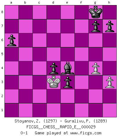 Last move : 0-1 2010 June 18 11:31:20 [Event "FICGS__CHESS__RAPID_E__000029"] [Site "FICGS"] [Date "2010.06.17"] [Round "1"] [White "Stoyanov,Zdravko"] [Black "Guralivu,Paul-Iosif"] [Result "0-1"] [WhiteElo "1297"] [BlackElo "1289"] 1.e4 c5 2.Nf3 d6 3.h3 Nc6 4.Bb5 Bd7 5.c3 e5 6.d3 a6 7.Bc4 b5 8.Bd5 Nf6 9.Bg5 Be7 10.Bxf6 Bxf6 11.O-O O-O 12.a3 Rc8 13.Nbd2 Ne7 14.Bb7 Rc7 15.Bd5 Nxd5 16.exd5 Qa8 17.c4 Rb8 18.b3 Rcb7 19.Ne4 Be7 20.Ned2 bxc4 21.dxc4 f5 22.Rb1 e4 23.Ne1 Bg5 24.a4 Bxd2 25.Qxd2 Bxa4 26.b4 Rxb4 27.Rxb4 cxb4 28.Qf4 b3 29.Qc1 b2 30.Qb1 Qb7 31.f3 Qb3 32.Rf2 Qd1 33.Rxb2 Qxb1 34.Rxb1 Rxb1 35.Kf2 Bb3 36.fxe4 fxe4 37.g3 Rxe1 38.Kxe1 Bxc4 39.Kd2 Bxd5 40.Ke3 Bb7 41.Kd4 d5 42.Kc3 e3 43.Kd3 d4 44.g4 Be4+ 0-1 Sicilian Kingside Castling by player White (move 11) Kingside Castling by player Black (move 11) 10 pieces endgame at move 39 : White KPP , Black KBPPPPP WHITE : King + 2 Pawns BLACK : King + 1 Bishop 5 Pawns Player Black won this chess game. Follow this game move after move (download)With or without the title, Bobby Fischer was unquestionably the greatest player of his time. (Burt Hochberg) Im Schach gewinnt jeder. Hat man Freunde am Spiel - und das ist die Hauptsache - ist auch der Verlust einer Partie kein Unglück. (David Bronstein) Fischer no está bajo la obligación de nadie. (Joseph Platz) Karpov est une pièce de musée. (Garry Kasparov) You cannot beat a roulette table unless you steal money from it. (Albert Einstein)