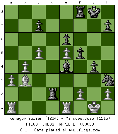 Last move : 0-1 2010 August 25 21:2:6 [Event "FICGS__CHESS__RAPID_E__000029"] [Site "FICGS"] [Date "2010.06.17"] [Round "1"] [White "Kehayov,Yulian"] [Black "Marques,Joao"] [Result "0-1"] [WhiteElo "1234"] [BlackElo "1215"] 1.d4 Nf6 2.Nc3 e6 3.e4 Bb4 4.Bd2 O-O 5.Bd3 d6 6.Nf3 Nc6 7.a3 Ba5 8.b4 Bb6 9.Be3 a6 10.O-O Bd7 11.Qe2 Ne7 12.e5 dxe5 13.dxe5 Nfd5 14.Nxd5 Nxd5 15.Bxb6 Nxb6 16.Qe4 g6 17.Qxb7 Nd5 18.c4 Nf4 19.Be4 Rb8 20.Qxa6 f5 21.Bc2 Bc8 22.Qa4 Bb7 23.Bd1 g5 24.Qb3 g4 25.Nd2 Bxg2 26.Re1 Qxd2 27.Qe3 Rbd8 28.Qxd2 Rxd2 29.c5 Be4 30.Bb3 Nh3+ 0-1 Queen's pawn game Kingside Castling by player Black (move 4) Kingside Castling by player White (move 10) Player Black won this chess game. Follow this game move after move (download)A good player is always lucky. (Jose Raul Capablanca) Über Kasparov: Es ist offensichtlich, daß er in einem totalitären Staat aufwuchs und deshalb zu diktatorischen Zügen neigt. (Viktor Kortschnoi) La enorme capacidad mental, en la que sin ella no puede un jugador de Ajedrez existir, es demasiado requerida por el Ajedrez al grado de que nunca podrá liberar su mente de este juego. (Albert Einstein) Le pion, dans sa simplicité, marche droit devant lui, mais lorsqu'il prend, il le fait obliquement? Ainsi l'homme, tant qu'il reste pauvre, marche dans la droiture et vit honnêtement, mais lorsqu'il recherche les honneurs, il flatte, se parjure et, par les voies obliques, cherche une position supérieure sur l'échiquier du monde. (Jean de Galles) Art disturbs, science reassures. (Georges Braque, Le Jour et la Nuit)