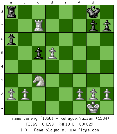 Last move : 1-0 2010 August 4 14:45:39 [Event "FICGS__CHESS__RAPID_E__000029"] [Site "FICGS"] [Date "2010.06.17"] [Round "1"] [White "Frame,Jeremy"] [Black "Kehayov,Yulian"] [Result "1-0"] [WhiteElo "1068"] [BlackElo "1234"] 1.e4 e5 2.Nf3 d5 3.Nxe5 Qe7 4.d4 Nc6 5.Nxc6 bxc6 6.e5 c5 7.Bb5+ Bd7 8.Bxd7+ Qxd7 9.c3 cxd4 10.cxd4 f6 11.Bf4 Be7 12.Nc3 fxe5 13.Bxe5 Bf6 14.Qe2 Bxe5 15.Qxe5+ Qe7 16.Qxe7+ Nxe7 17.O-O O-O 18.Rfe1 a6 19.Rxe7 Rae8 20.Rae1 Rxe7 21.Rxe7 Rc8 22.Nxd5 c6 23.Nc3 c5 24.d5 Ra8 25.Rc7 1-0 QP counter-gambit (elephant gambit) Kingside Castling by player White (move 17) Kingside Castling by player Black (move 17) Player White won this chess game. Follow this game move after move (download)Life is a kind of Chess, with struggle, competition, good and ill events. (Benjamin Franklin) Ein Kibitz ist einer, der deinem Gegner gute Ratschläge gibt. (Andrew Soltis) El Ajedrez era la lengua materna de Capablanca. (Reti) Le génie consiste à savoir transgresser les règles au moment opportun. (Teichmann) Lottery : A tax on people who are bad at math. (Author unknown)