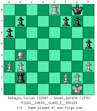Last move : 1-0 2010 July 10 19:14:59 [Event "FICGS__CHESS__CLASS_E__000124"] [Site "FICGS"] [Date "2010.06.17"] [Round "1"] [White "Kehayov,Yulian"] [Black "Gonet,Gerard"] [Result "1-0"] [WhiteElo "1234"] [BlackElo "1370"] 1.d4 d5 2.e3 Nc6 3.Nf3 Bg4 4.Be2 Bxf3 5.Bxf3 e5 6.dxe5 Nge7 7.O-O Nxe5 8.Nc3 c6 9.e4 Nxf3+ 10.Qxf3 Ng6 11.exd5 Be7 12.dxc6 Ne5 13.Qe4 Nxc6 14.Nd5 O-O 15.Nxe7+ Qxe7 16.Qxe7 Nxe7 17.Be3 a6 18.Bc5 Rfe8 19.Rfe1 Nc6 20.Rxe8+ Rxe8 21.h3 Re2 22.Rc1 h5 23.a3 Ne5 24.Bb4 Nc4 25.b3 Ne5 26.Re1 Rxc2 27.Rxe5 Rb2 28.Re8+ 1-0 Queen's pawn game Kingside Castling by player White (move 7) Kingside Castling by player Black (move 14) Player White won this chess game. Follow this game move after move (download)Life is a kind of Chess, with struggle, competition, good and ill events. (Benjamin Franklin) Strategie ist, wie man ein Mädchen auf den Rücksitz bekommt. Taktik ist, was man tut, wenn man dann dort ist. (Anonymous) Todo se encuentra en un estado de flujo y esto incluye al mundo del Ajedrez. (Mikhail Botvinnik) Soyez une menace à chaque fois que vous vous asseyez pour jouer. (Ken Smith) Live, lose, and learn, by observing your opponent how to win. (Amber Steenbock)