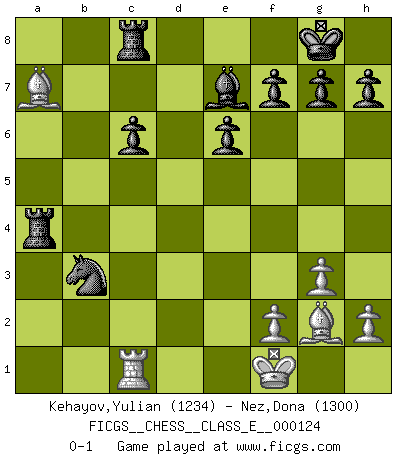 Last move : 0-1 2010 August 4 14:47:35 [Event "FICGS__CHESS__CLASS_E__000124"] [Site "FICGS"] [Date "2010.06.17"] [Round "1"] [White "Kehayov,Yulian"] [Black "Nez,Dona"] [Result "0-1"] [WhiteElo "1234"] [BlackElo "1300"] 1.g3 d5 2.d4 Nf6 3.Bg2 e6 4.Nf3 Be7 5.O-O O-O 6.Nc3 Nc6 7.Ne5 Nxe5 8.e4 Nc4 9.e5 Nd7 10.b3 Na5 11.Bd2 c5 12.Ne2 cxd4 13.Nxd4 Nxe5 14.Bf4 Nec6 15.Nxc6 bxc6 16.Qd3 Bb7 17.c4 Ba6 18.Qd4 dxc4 19.Qxd8 Rfxd8 20.bxc4 Bxc4 21.Rac1 Bxf1 22.Kxf1 Rac8 23.a4 Rd4 24.Be3 Rxa4 25.Bxa7 Nb3 0-1 Benko's Opening Kingside Castling by player White (move 5) Kingside Castling by player Black (move 5) Player Black won this chess game. Follow this game move after move (download)To avoid losing a piece, many a person has lost the game. (Savielly Tartakover) Schach ist das schnellste Spiel der Welt, weil man in jeder Sekunde Tausende von Gedanken ordnen muß. (Albert Einstein) El Ajedrez, como cualquier otra actividad creativa, puede existir solo a través de méritos combinados de aquellos que tienen talento creativo y de aquellos que tienen la habilidad de organizar un trabajo creativo. (Mikhail Botvinnik) Horreur, mais aussi harmonie suprême : qu'y avait-il en effet au monde en dehors des échecs ? Le brouillard, l'inconnu, le non-être... (Vladimir Nabokov) You can't play chess if you're groggy from pills. (Anatoly Karpov)