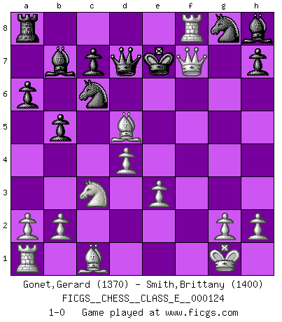 Last move : 1-0 2010 June 22 18:3:44 [Event "FICGS__CHESS__CLASS_E__000124"] [Site "FICGS"] [Date "2010.06.17"] [Round "1"] [White "Gonet,Gerard"] [Black "Smith,Brittany"] [Result "1-0"] [WhiteElo "1370"] [BlackElo "1400"] 1.f4 d5 2.c4 e6 3.d4 a6 4.cxd5 exd5 5.Nc3 g6 6.Nf3 Nc6 7.e3 Be7 8.Be2 Qd7 9.O-O b6 10.Ne5 Qd6 11.Bf3 Bf6 12.Bxd5 Bb7 13.Nxf7 Qd7 14.Nxh8 Bxh8 15.f5 gxf5 16.Qh5+ Kd8 17.Rxf5 b5 18.Rf8+ Ke7 19.Qf7+ 1-0 Mujannah Opening Kingside Castling by player White (move 9) Player White won this chess game. Follow this game move after move (download)You need not play well - just help your opponent to play badly. (Genrikh Chepukaitis) Ich hatte meine größten Erfolge, als ich 47 Jahre alt war. Kasparow war noch nicht mal 42 und hat das Schach schon im Stich gelassen. (Viktor Kortschnoi) Bobby es la celebridad menos entendida y malinterpretada que camina el la faz de esta tierra. (Yasser Seirawan) Ce qui caractérise les parties de combat, c'est que si le défenseur a constamment de difficiles problèmes à résoudre, l'attaquant doit chercher sans relâche de nouvelles possibilités d'attaque. (Koblentz) When a man with money meets a man with experience, the man with experience leaves with money and the man with money leaves with experience. (Anonymous)