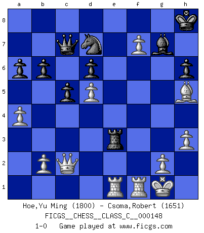 Last move : 1-0 2010 August 20 12:19:2 [Event "FICGS__CHESS__CLASS_C__000148"] [Site "FICGS"] [Date "2010.06.18"] [Round "1"] [White "Hoe,Yu Ming"] [Black "Csoma,Robert"] [Result "1-0"] [WhiteElo "1800"] [BlackElo "1651"] 1.d4 Nf6 2.c4 c5 3.d5 e6 4.Nf3 exd5 5.cxd5 d6 6.Nc3 g6 7.h3 Bg7 8.e4 O-O 9.Bd3 a6 10.a4 Nbd7 11.O-O Qc7 12.Bg5 h6 13.Be3 b6 14.Qc1 Kh7 15.Nd2 Ne5 16.Be2 Bb7 17.f4 Ned7 18.Qc2 Rfe8 19.Nc4 Nxd5 20.Nxd5 Bxd5 21.exd5 Re7 22.f5 Rae8 23.Bh5 Rxe3 24.fxg6+ Kh8 25.gxf7 R8e7 26.Nxe3 Rxe3 27.Rae1 1-0 Benoni defense Kingside Castling by player Black (move 8) Kingside Castling by player White (move 11) Player White won this chess game. Follow this game move after move (download)A Chess game is divided into three stages: the first, when you hope you have the advantage, the second when you believe you have an advantage, and the third... when you know you're going to lose ! (Savielly Tartakower) Mit Schach schule ich mein Gefühl für Geometrie, was für Tennis und Schach gleichermaßen wichtig ist. (Boris Becker) Un mal plan es mejor que no tener ningún plan. (Frank Marshall) Pour se monter efficace, un Cavalier a besoin d'avant-postes ! Les Cavaliers font les meilleurs bloqueurs de pions passés. There is a very easy way to return from a casino with a small fortune : go there with a large one. (Jack Yelton)