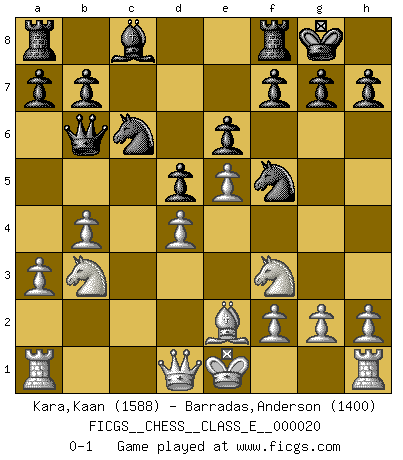 Last move : 0-1 2007 January 16 0:25:45 [Event "FICGS__CHESS__CLASS_E__000020"] [Site "FICGS"] [Date "2006.11.05"] [Round "1"] [White "Kara,Kaan"] [Black "Barradas,Anderson"] [Result "0-1"] [WhiteElo "1588"] [BlackElo "1400"] 1.e4 c5 2.Nf3 e6 3.d4 d5 4.e5 Nc6 5.c3 Qa5 6.Bd2 cxd4 7.cxd4 Bb4 8.a3 Bxd2+ 9.Nbxd2 Nge7 10.b4 Qb6 11.Nb3 Nf5 12.Be2 O-O 0-1 Sicilian : Marshall variation Kingside Castling by player Black (move 12) Player Black won this chess game. Follow this game move after move (download)Of all my Russian books, the defense contains and diffuses the greatest 'warmth' which may seem odd seeing how supremely abstract Chess is supposed to be. (Vladimir Nabokov) Schon mancher Spieler hat aufgegeben, um zu vermeiden, daß er eine Figur verliert. (Savielly Grigorievitsch Tartakower) En el Ajedrez, tal como en la vida, las bendiciones de hoy pueden ser el veneno del mañana. (Assaic) Mais n'est-ce pas déjà le limiter injurieusement que d'appeler les échecs un jeu? N'est-ce pas aussi une science, un art, ou quelque chose qui, comme le cercueil de Mahomet entre ciel et terre, est suspendu entre l'un et l'autre, et qui réunit un nombre incroyable de contraires ? (Stefan Zweig) Political correctness is subjecting us to gross incompetence. (Johann Piek)