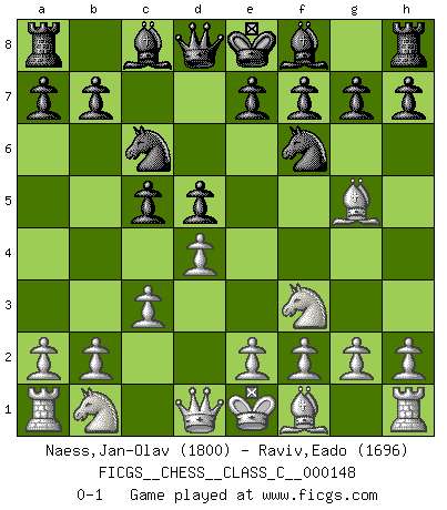 Last move : 0-1 2010 July 29 21:51:30 [Event "FICGS__CHESS__CLASS_C__000148"] [Site "FICGS"] [Date "2010.06.18"] [Round "1"] [White "Naess,Jan-Olav"] [Black "Raviv,Eado"] [Result "0-1"] [WhiteElo "1800"] [BlackElo "1696"] 1.d4 d5 2.Nf3 Nf6 3.Bg5 c5 4.c3 Nc6 0-1 This chess game has been lost on time (started : 2010.06.18 3:1:32) Torre attack (Tartakower variation) Player Black won this chess game. Follow this game move after move (download)A thorough understanding of the typical mating continuations makes the most complicated sacrificial combinations leading up to them not only not difficult, but almost a matter of course. (Siegbert Tarrasch) Bogoljubow: Matt in vier Zügen! Tartakower: Ich verbitte mir jede Belästigung! (Savielly Grigorievitsch Tartakower) En partidas rápidas, el Caballo es mas poderoso que el Alfil. (Vlastimil Hort) Votre seul travail dans les ouvertures est d'obtenir un milieu de partie jouable. (Lajos Portish) The beginning of wisdom is silence. The second step is listening. (Unknown)