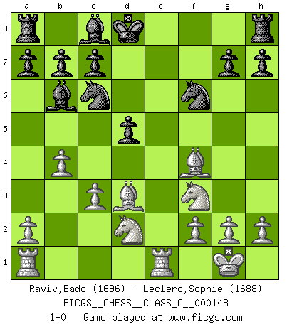 Last move : 1-0 2010 July 4 17:45:8 [Event "FICGS__CHESS__CLASS_C__000148"] [Site "FICGS"] [Date "2010.06.18"] [Round "1"] [White "Raviv,Eado"] [Black "Leclerc,Sophie"] [Result "1-0"] [WhiteElo "1696"] [BlackElo "1688"] 1.e4 e5 2.Nf3 Nc6 3.d4 exd4 4.Bc4 Bc5 5.c3 d3 6.O-O Nf6 7.b4 Bb6 8.e5 d5 9.Bxd3 Ng4 10.Qe1 Qe7 11.Bf4 f6 12.exf6 Nxf6 13.Qxe7+ Kxe7 14.Re1+ Kd8 15.Nbd2 1-0 Scotch gambit Kingside Castling by player White (move 6) Player White won this chess game. Follow this game move after move (download)If one piece is badly posted, the whole game is bad. (Tarrasch) Je mehr wir mit Computern analysieren, desto mehr glauben wir an Verteidigung. (Vladimir Kramnik) Las leyes del Ajedrez no permiten una libre elección: tienes que mover quieras o no. (Emanuel Lasker) C'est la seule position que je connaisse où les deux camps sont mals. Propos prêtés à V. Anand. Begin at the beginning and go on till you come to the end; then stop. (Lewis Carrol, Alice in Wonderland)