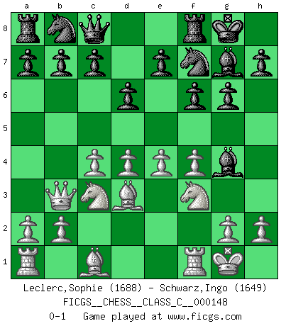Last move : 0-1 2010 August 9 10:18:44 [Event "FICGS__CHESS__CLASS_C__000148"] [Site "FICGS"] [Date "2010.06.18"] [Round "1"] [White "Leclerc,Sophie"] [Black "Schwarz,Ingo"] [Result "0-1"] [WhiteElo "1688"] [BlackElo "1649"] 1.f4 g6 2.e4 Bg7 3.Nf3 f6 4.d4 Nh6 5.Bd3 Nf7 6.O-O O-O 7.c4 d6 8.Nc3 Bg4 9.Qb3 Qc8 0-1 This chess game has been lost on time (started : 2010.06.18 3:1:32) Bird's Opening Kingside Castling by player White (move 6) Kingside Castling by player Black (move 6) Player Black won this chess game. Follow this game move after move (download)The boy (then a 12 year old boy named Anatoly Karpov) doesn't have a clue about Chess, and there's no future at all for him in this profession. (Mikhail Botvinnik) Bis jetzt ist Weiß einer wohlbekannten Analyse gefolgt. Aber jetzt begeht er einen schrecklichen Fehler: Er beginnt seinen eigenen Kopf zu benutzen. (Siegbert Tarrasch) El Ajedrez es el arte del análisis. (Mikhail Botvinnik) Votre prénom est 'Tactique', votre deuxième prénom est 'Tactique' et votre nom est 'Tactique'. (Ken Smith) Perseverance does not equal worthiness. Next time you want to get my attention, wear something fun. Low-riding jeans are hot. (Gregory House, House M.D.)