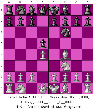 Last move : 1-0 2010 July 30 9:52:19 [Event "FICGS__CHESS__CLASS_C__000148"] [Site "FICGS"] [Date "2010.06.18"] [Round "1"] [White "Csoma,Robert"] [Black "Naess,Jan-Olav"] [Result "1-0"] [WhiteElo "1651"] [BlackElo "1800"] 1.Nf3 d5 2.d4 Nf6 3.Bf4 1-0 This chess game has been lost on time (started : 2010.06.18 3:1:32) Reti Opening Player White won this chess game. Follow this game move after move (download)Could we look into the head of a Chess player, we should see there a whole world of feelings, images, ideas, emotion and passion. (Alfred Binet) Es hat in meinem Leben Zeiten gegeben, in denen das Schachspiel, wenn nicht zum Lebenszweck, so doch zu einem regelrechten Lebensersatz geworden ist. Man fühlt sich in solchen Zeiten nicht so, als besäße man eine göttliche Gabe, sondern eher so, als sei man von ihr besessen. (Garry Kasparov) EL Ajedrez es como la vida. (Boris Spassky) La victoire dans une partie d'Echecs appartient la plupart du temps à celui qui voit un peu plus loin que l'adversaire. (Lasker) There's always a bigger fish. (Qui-Gon Jinn in Star Wars ep.1)