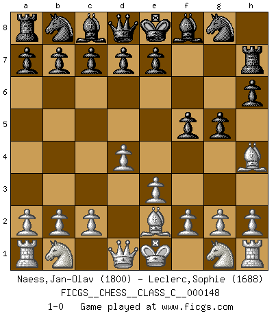 Last move : 1-0 2010 September 4 11:7:39 [Event "FICGS__CHESS__CLASS_C__000148"] [Site "FICGS"] [Date "2010.06.18"] [Round "1"] [White "Naess,Jan-Olav"] [Black "Leclerc,Sophie"] [Result "1-0"] [WhiteElo "1800"] [BlackElo "1688"] 1.d4 f5 2.Bg5 h6 3.Bh4 g5 4.e3 Rh7 5.Be2 1-0 This chess game has been lost on time (started : 2010.06.18 3:1:32) Dutch, 2.Bg5 variation Player White won this chess game. Follow this game move after move (download)Chess, like love, is infectious at any age. (Flohr) Mein erstes Ziel war nicht, die Partie zu gewinnen, sondern eine Figur zu opfern. -- der junge (Wilhelm Steinitz) Observen a Garry Kasparov. Después de una derrota, invariablemente el gana la próxima partida. Prácticamente hace pedazos a su siguiente oponente. Eso es algo que tenemos que aprender a lograr. (Maurice Ashley) Je menace de comprendre la position. (Anonyme) Perhaps chess is the wrong game for the times (The Chess Master and the Computer, by Garry Kasparov - 2010)