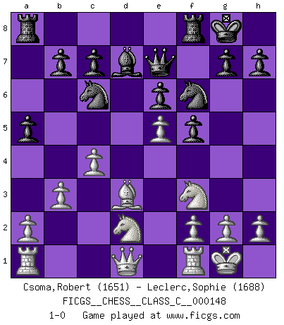 Last move : 1-0 2010 September 6 11:19:15 [Event "FICGS__CHESS__CLASS_C__000148"] [Site "FICGS"] [Date "2010.06.18"] [Round "1"] [White "Csoma,Robert"] [Black "Leclerc,Sophie"] [Result "1-0"] [WhiteElo "1651"] [BlackElo "1688"] 1.Nf3 f5 2.d4 Nf6 3.e3 e6 4.b3 Be7 5.Ba3 d6 6.Nbd2 O-O 7.Bd3 Nc6 8.O-O Bd7 9.c4 Qe8 10.e4 a5 11.e5 dxe5 12.Bxe7 Qxe7 13.dxe5 1-0 Reti v Dutch Kingside Castling by player Black (move 6) Kingside Castling by player White (move 8) Player White won this chess game. Follow this game move after move (download)When you are lonely, when you feel yourself an alien in the world, play Chess. This will raise your spirits and be your counselor in war. (Aristotle) Schach ist wie eine schöne Frau, zu der wir ständig zurückkehren, gleichviel, wie oft sie uns zurückweist. (Anonymous) Aquel que teme a un Peón de Reina aislado, debería de retirarse del Ajedrez. (Siegbert Tarrasch) Mais n'est-ce pas déjà le limiter injurieusement que d'appeler les échecs un jeu? N'est-ce pas aussi une science, un art, ou quelque chose qui, comme le cercueil de Mahomet entre ciel et terre, est suspendu entre l'un et l'autre, et qui réunit un nombre incroyable de contraires ? (Stefan Zweig) Computer Science is no more about computers than astronomy is about telescopes. (Edsger W. Dijkstra)