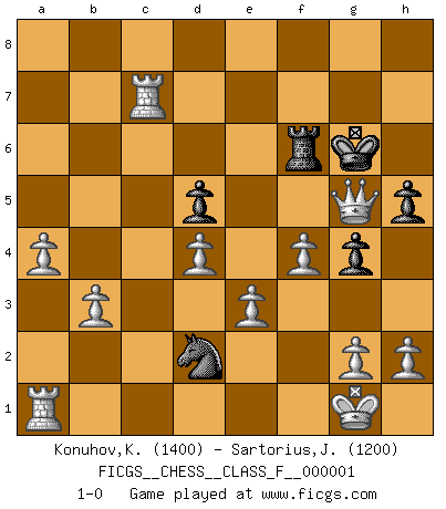 Last move : 1-0 2006 May 15 22:36:32 [Event "FICGS__CHESS__CLASS_F__000001"] [Site "FICGS"] [Date "2006.04.28"] [Round "1"] [White "Konuhov,Konstantin"] [Black "Sartorius,Julien"] [Result "1-0"] [WhiteElo "1400"] [BlackElo "1200"] 1.d4 d5 2.c4 c6 3.b3 Bf5 4.Nc3 Nf6 5.Nf3 Nbd7 6.Nh4 e6 7.Nxf5 exf5 8.a3 h6 9.e3 g5 10.Bd3 b5 11.cxb5 cxb5 12.Bxf5 Nb6 13.Nxb5 Be7 14.Qc2 Rc8 15.Bxc8 Nxc8 16.O-O Nd6 17.Qc6+ Qd7 18.Qxd7+ Kf8 19.Qxa7 h5 20.a4 Rh6 21.Ba3 Nfe4 22.f3 Nd2 23.Nxd6 Bxd6 24.Bxd6+ Rxd6 25.Qb8+ Ke7 26.Rfc1 g4 27.Rc7+ Ke6 28.Qe8+ Kf5 29.Qxf7+ Kg5 30.Qe7+ Rf6 31.f4 Kf5 32.Qe5+ Kg6 33.Qg5+ 1-0 QGD Slav defense Kingside Castling by player White (move 16) Player White won this chess game. Follow this game move after move (download)You know you're going to lose. Even when I was ahead I knew I was going to lose. - On playing against Fischer. (Andrew Soltis) Ich bin es gewohnt, das die Jugend mir überhaupt keinen Respekt entgegenbringt. (Alexander Morozewich) ¡Examina movidas que hagan daño! Un buen ojo for movidas desvastantes es mucho mas importante que el conocimiento de principios estratégicos. (Purdy) Echiquier : carré parfait, comme la Jérusalem nouvelle décrite par l'auteur de l'Apocalypse, huit cases sur huit, exaltation du chiffre 4, symbole du cosmos aux quatre horizons... où le noir et le blanc, l'ombre et la lumière, le mal et le bien s'entremêlent et se conjuguent. (Robert Couffignal, Le Gambit du poète) Panic is a sudden desertion of us, an a going over to the enemy of our imagination. (Christian Nevell Bovee)