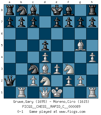 Last move : 0-1 2010 July 26 21:11:4 [Event "FICGS__CHESS__RAPID_C__000089"] [Site "FICGS"] [Date "2010.06.18"] [Round "1"] [White "Gruwe,Gary"] [Black "Moreno,Ciro"] [Result "0-1"] [WhiteElo "1695"] [BlackElo "1615"] 1.d4 d5 2.Nf3 Nf6 3.Bg5 Ne4 4.h4 Qd6 5.e3 Qb4+ 6.Nbd2 Qxb2 7.Rb1 Qxa2 8.Bd3 Nc3 0-1 Torre attack (Tartakower variation) Player Black won this chess game. Follow this game move after move (download)Chess is a beautiful mistress. (Bent Larsen) Ein unbeabsichtigtes Patt ist der Gipfel der Dummheit. (Anonymous) El poder defensivo de una pieza clavada, solamente es imaginario. (Aaron Nimzovich) Les ravages du H expliquent la différence de niveau entre Tal et Thal [Abergel]. Good decisions come from experience, and experience comes from bad decisions. (Anonymous)
