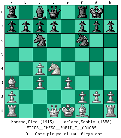 Last move : 1-0 2010 August 11 10:32:16 [Event "FICGS__CHESS__RAPID_C__000089"] [Site "FICGS"] [Date "2010.06.18"] [Round "1"] [White "Moreno,Ciro"] [Black "Leclerc,Sophie"] [Result "1-0"] [WhiteElo "1615"] [BlackElo "1688"] 1.c4 e5 2.Nc3 Nc6 3.Nf3 Nf6 4.d4 exd4 5.Nxd4 Bb4 6.e3 Bxc3+ 7.bxc3 O-O 8.Ba3 1-0 This chess game has been lost on time (started : 2010.06.18 3:5:10) English : Four knights system Kingside Castling by player Black (move 7) Player White won this chess game. Follow this game move after move (download)A thorough understanding of the typical mating continuations makes the most complicated sacrificial combinations leading up to them not only not difficult, but almost a matter of course. (Siegbert Tarrasch) Es hat in meinem Leben Zeiten gegeben, in denen das Schachspiel, wenn nicht zum Lebenszweck, so doch zu einem regelrechten Lebensersatz geworden ist. Man fühlt sich in solchen Zeiten nicht so, als besäße man eine göttliche Gabe, sondern eher so, als sei man von ihr besessen. (Garry Kasparov) Yo no creo en la psicología. Yo creo en las buenas movidas. (Bobby Fischer) Seul un grand joueur sait à quel point il joue faiblement. (Xavier Tartacover) Man is reluctant to give credit for intelligence to anyone, except his enemies. (Albert Einstein)