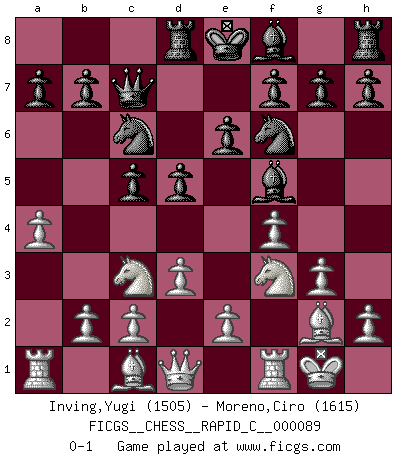 Last move : 0-1 2010 August 8 22:15:36 [Event "FICGS__CHESS__RAPID_C__000089"] [Site "FICGS"] [Date "2010.06.18"] [Round "1"] [White "Inving,Yugi"] [Black "Moreno,Ciro"] [Result "0-1"] [WhiteElo "1505"] [BlackElo "1615"] 1.f4 Nf6 2.Nf3 c5 3.d3 d5 4.g3 Bf5 5.Bg2 Nc6 6.O-O Qc7 7.Nc3 Rd8 8.a4 e6 0-1 This chess game has been lost on time (started : 2010.06.18 3:5:10) Bird's Opening Kingside Castling by player White (move 6) Player Black won this chess game. Follow this game move after move (download)Nowadays, when you're not a grandmaster at 14, you can forget about it. (Anand Viswanathan) Ich verlor meine Bürgerrechte, mein Gehalt wurde mir nicht mehr bezahlt und ich wurde zensiert und durfte nicht mehr ins Ausland reisen. [nach dem Match Fischer-Taimanov 6:0] (Mark Taimanov) Yo considero que Fischer es uno de los expertos mas grandes de aperturas de siempre. (Keith Hayward) Les Echecs ont trois composantes : le temps, l'espace et le matériel en dernier. (Mikhail Tal) You must have a dream in order to have it come true. (A.P.J. Kalam)