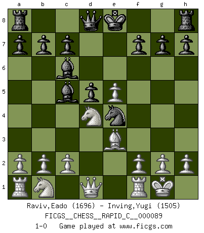 Last move : 1-0 2010 August 2 21:58:31 [Event "FICGS__CHESS__RAPID_C__000089"] [Site "FICGS"] [Date "2010.06.18"] [Round "1"] [White "Raviv,Eado"] [Black "Inving,Yugi"] [Result "1-0"] [WhiteElo "1696"] [BlackElo "1505"] 1.e4 e5 2.Nf3 Nc6 3.d4 exd4 4.Bc4 Nf6 5.e5 d5 6.Bb5 Ne4 7.Nxd4 Bd7 8.Bxc6 Bxc6 9.O-O Bc5 10.Be3 1-0 This chess game has been lost on time (started : 2010.06.18 3:5:10) Scotch gambit : Dubois-Reti defense Kingside Castling by player White (move 9) Player White won this chess game. Follow this game move after move (download)All I want to do, ever, is just play Chess. (Bobby Fischer) Viele Opfer benötigen überhaupt keine konkrete Berechnung. Es genügt sich die entstehende Position kurz vorzustellen, um uns davon zu überzeugen, dass das Opfer korrekt ist. (Mikhail Nekhemyevich Tal) Juega la Apertura como un libro, el Juego Medio como un mago y los Finales como una máquina. (Spielmann) À la honte des hommes, on sait que les lois du jeu sont les seules qui soient partout justes, claires, inviolables et exécutées. Pourquoi l'Indien qui a donné les règles du jeu d'échecs est-il obéi de bon gré dans toute la terre, et que les décrétales des papes, par exemple, sont aujourd'hui un objet d'horreur et de mépris ? C'est que l'inventeur des échecs combina tout avec justesse pour la satisfaction des joueurs, et que les papes, dans leurs décrétales, n'eurent en vue que leur seul avantage. L'Indien voulut exercer également l'esprit des hommes et leur donner du plaisir; les papes ont voulu abrutir l'esprit des hommes. Voltaire (Dictionnaire philosophique / Garnier 1967) Warrior pose battles inner weakness and wins focus. You see that there is no war within you. You're on your own side, and you are your own strength. (Terri Guillemets)