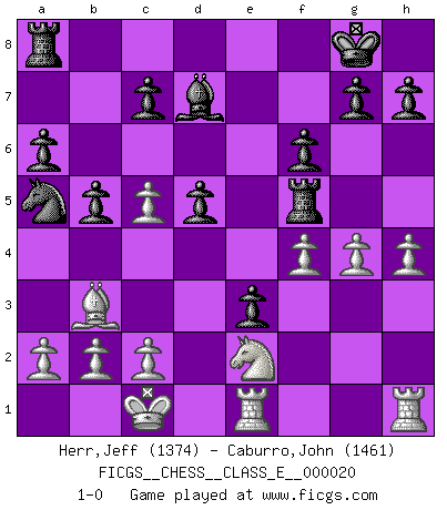 Last move : 1-0 2006 November 28 0:22:46 [Event "FICGS__CHESS__CLASS_E__000020"] [Site "FICGS"] [Date "2006.11.05"] [Round "1"] [White "Herr,Jeff"] [Black "Caburro,John"] [Result "1-0"] [WhiteElo "1374"] [BlackElo "1461"] 1.d4 f5 2.e4 fxe4 3.Nc3 Nf6 4.Bg5 Nc6 5.Bxf6 exf6 6.f3 d5 7.Qd2 Bb4 8.O-O-O O-O 9.h4 Re8 10.Bb5 e3 11.Qd3 a6 12.Ba4 b5 13.Bb3 Bxc3 14.Qxc3 Qd6 15.Re1 Bd7 16.Qc5 Qxc5 17.dxc5 Re5 18.f4 Rf5 19.Ne2 Na5 20.g4 1-0 Dutch : Staunton gambit, Staunton's line Queenside Castling by player White (move 8) Kingside Castling by player Black (move 8) Player White won this chess game. Follow this game move after move (download)Chess is a forcing house where the fruits of character can ripen more fully than in life. (Edward Morgan Foster) Wenn Du absolut nicht mehr weißt, was Du tun sollst, dann ist es Zeit für Panik. (John van der Wiel) Aquel que teme a un Peón de Reina aislado, debería de retirarse del Ajedrez. (Siegbert Tarrasch) Avant la finale, les dieux ont créé le milieu de partie. (Tarrasch) Knowledge rests not upon truth alone, but upon error also. (Carl G. Jung)