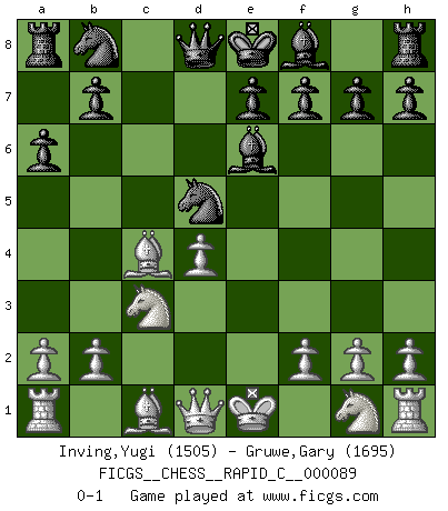 Last move : 0-1 2010 August 5 10:12:11 [Event "FICGS__CHESS__RAPID_C__000089"] [Site "FICGS"] [Date "2010.06.18"] [Round "1"] [White "Inving,Yugi"] [Black "Gruwe,Gary"] [Result "0-1"] [WhiteElo "1505"] [BlackElo "1695"] 1.c4 Nf6 2.Nc3 c6 3.e4 d5 4.exd5 cxd5 5.d4 a6 6.cxd5 Nxd5 7.Bc4 Be6 0-1 This chess game has been lost on time (started : 2010.06.18 3:5:10) English Opening Player Black won this chess game. Follow this game move after move (download)The older I grow, the more I value pawns. (Paul Keres) Es ist peinlich, dass ich nie Weltmeister wurde. Es wäre leicht, Leonid Breschnjew als Ursache vorzuschieben, dessen Apparat den Vorzeigekommunisten Anatoli Karpow in allem unterstützte. Aber Garri Kasparow zum Beispiel, der ebenfalls von den Sowjets unerwünscht war, hat trotz der Widerstände den WM-Titel erobert. (Viktor Kortschnoi) Yo no le temo a Spassky. Todos saben que yo soy el mejor. Uno no necesita un torneo para probarlo. (Bobby Fischer) Karpov est une pièce de musée. (Garry Kasparov) Logic : The art of thinking and reasoning in strict accordance with the limitations and incapacities of the human misunderstanding. (Ambrose Bierce)