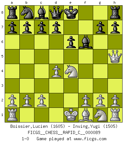 Last move : 1-0 2010 August 4 10:8:8 [Event "FICGS__CHESS__RAPID_C__000089"] [Site "FICGS"] [Date "2010.06.18"] [Round "1"] [White "Boissier,Lucien"] [Black "Inving,Yugi"] [Result "1-0"] [WhiteElo "1605"] [BlackElo "1505"] 1.d4 f5 2.Nc3 Nf6 3.Bg5 e6 4.e4 fxe4 5.Nxe4 Be7 6.Bxf6 Bxf6 7.Qh5+ 1-0 This chess game has been lost on time (started : 2010.06.18 3:5:10) Dutch Player White won this chess game. Follow this game move after move (download)What is the object of playing a gambit opening?... To acquire a reputation of being a dashing player at the cost of losing a game. (Siegbert Tarrasch) Ich kenne keine einzige Person, die behaupten würde, Garri Kasparow sei ein guter Mensch (Nigel Short) Hay jugadores fuertes y personas amables y yo soy un jugador fuerte. (Bobby Fischer) Vous n'êtes pas toujours obligé de jouer le meilleur coup. Un coup doit être actif, entreprenant, correct et beau ! (David Bronstein) When you've done things right people won't know you've done anything at all. (Futurama)