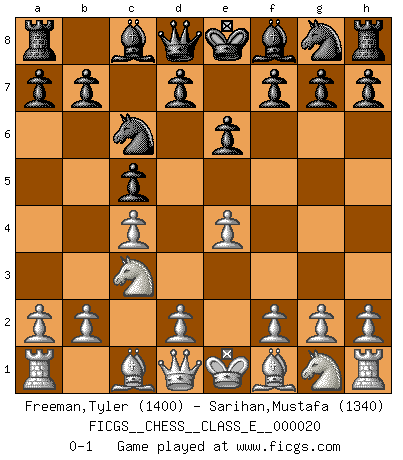 Last move : 0-1 2007 January 2 15:40:12 [Event "FICGS__CHESS__CLASS_E__000020"] [Site "FICGS"] [Date "2006.11.05"] [Round "1"] [White "Freeman,Tyler"] [Black "Sarihan,Mustafa"] [Result "0-1"] [WhiteElo "1400"] [BlackElo "1340"] 1.e4 c5 2.c4 Nc6 3.Nc3 e6 0-1 This chess game has been lost on time (started : 2006.11.05 3:50:18) Sicilian defense Player Black won this chess game. Follow this game move after move (download)Modern Chess is too much concerned with things like Pawn structure. Forget it, Checkmate ends the game. (Nigel Short) Wenn Schach ein enormer Dschungel ist, der seine Myriaden von Geheimnissen nicht preisgeben will, dann sind Computer die Kettensägen einer gewaltigen ökologisch unsensiblen Nutzholzfirma. (Nigel Short) Una mala movida nulifica cuarenta buenas. (Horowitz) Seul un grand joueur sait à quel point il joue faiblement. (Xavier Tartacover) Two beer, or not two beer. (Unknown)