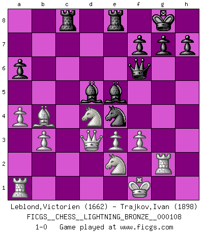 Last move : 1-0 2010 June 20 14:14:49 [Event "FICGS__CHESS__LIGHTNING_BRONZE__000108"] [Site "FICGS"] [Date "2010.06.20"] [Round "1"] [White "Leblond,Victorien"] [Black "Trajkov,Ivan"] [Result "1-0"] [WhiteElo "1662"] [BlackElo "1898"] 1.Nf3 Nf6 2.d4 d5 3.c4 e6 4.e3 c6 5.Nc3 Nbd7 6.Bd3 dxc4 7.Bxc4 b5 8.Bd3 Bb7 9.Bd2 a6 10.a4 b4 11.Ne2 c5 12.Nf4 Bd6 13.dxc5 Nxc5 14.Bc2 e5 15.Ne2 e4 16.Nfd4 Nd3+ 17.Bxd3 exd3 18.Nc1 Bxg2 19.Rg1 Be4 20.Qb3 O-O 21.f3 Bd5 22.Qxd3 Bxh2 23.Rg2 Be5 24.Bxb4 Re8 25.Kf2 Ne4+ 26.Kf1 Qf6 27.Nce2 Rac8 28.b3 1-0 This chess game has been lost on time (started : 2010.06.20 12:25:17) Reti Opening Kingside Castling by player Black (move 20) Player White won this chess game. Follow this game move after move (download)Bobby is the most misunderstood, misquoted celebrity walking the face of this earth. (Yasser Seirawan) Zeige mir drei Eröffnungsvarianten und ich beweise dir, dass zwei davon inkorrekt sind. (Emanuel Lasker) Bobby Fischer es el jugador de Ajedrez mas grande que jamás haya existido. (Ken Smith) Assurément je connaissais par expérience le mystérieux attrait de ce jeu royal, le seul entre tous les jeux inventés par les hommes qui échappe souverainement à la tyrannie du hasard, le seul où l'on ne doive sa victoire qu'à son intelligence ou plutôt à une certaine forme d'intelligence. Mais n'est-ce pas déjà le limiter injurieusement que d'appeler les échecs un jeu ? N'est-ce pas une science, un art ou quelque chose qui, comme le cercueil de Mahomet entre ciel et terre, est suspendu entre l'un et l'autre, et qui réunit un nombre incroyable de contraires ? [...] C'est une pensée qui ne mène à rien, une mathématique qui n'établit rien, un art qui ne laisse pas d'uvre, une architecture sans matière; et il l'a prouvé néanmoins qu'il était plus durable, à sa manière, que les livres ou que tout autre monument, ce jeu unique qui appartient à tous les peuples et à tous les temps, et dont personne ne sait quel dieu en fit don à la terre pour tuer l'ennui, pour aiguiser l'esprit et stimuler l'âme. Où commence-t-il, où finit-il ? (Stefan Zweig) The Internet is the first thing that humanity has build that humanity doesn't understand, the largest experiment in anarchy that we have ever had. (Eric Schmidt)