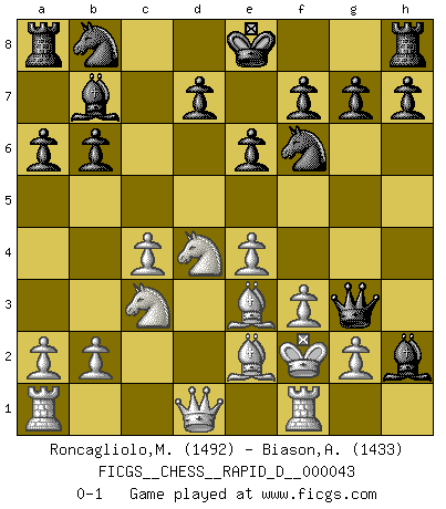 Last move : 0-1 2010 July 3 22:39:33 [Event "FICGS__CHESS__RAPID_D__000043"] [Site "FICGS"] [Date "2010.06.20"] [Round "1"] [White "Roncagliolo,Marco"] [Black "Biason,Adriano"] [Result "0-1"] [WhiteElo "1492"] [BlackElo "1433"] 1.e4 c5 2.Nf3 a6 3.d4 cxd4 4.Nxd4 e6 5.c4 b6 6.Nc3 Bb7 7.Be2 Qc7 8.O-O Nf6 9.f3 Bd6 10.Be3 Bxh2+ 11.Kf2 Qg3+ 0-1 Sicilian : O'Kelly variation Kingside Castling by player White (move 8) Player Black won this chess game. Follow this game move after move (download)Don't even mention losing to me. I can't stand to think of it. (Bobby Fischer) Offensichtlich kennt Kasparow nichts anderes als Schach, und ich könnte 500 weitere Spieler dieser Sorte benennen. (Judith Polgar) Fischer sacrificó virtualmente todo lo que la mayoría de nosotros los 'debiles' (término que él usa) valoramos, respetamos y apreciamos por el amor de un astuto, a menudo hermoso tablero de juego, por el privilegio ambivalente de ser su mas grande maestro. (Paul Kollar) Donnez-moi un Cavalier en 6e et je gagnerais toutes mes parties. (Steinitz) There are more things in heaven and earth than practically anywhere else. (Unknown)