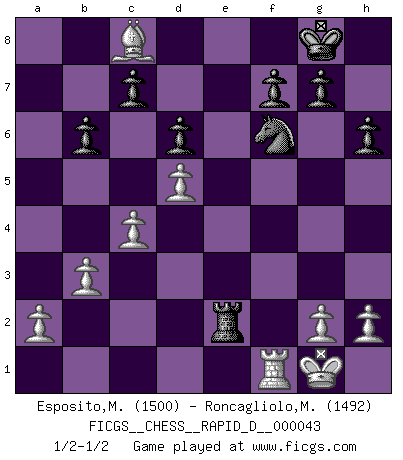 Last move : 1/2-1/2 2010 July 12 23:37:34 [Event "FICGS__CHESS__RAPID_D__000043"] [Site "FICGS"] [Date "2010.06.20"] [Round "1"] [White "Esposito,Marco"] [Black "Roncagliolo,Marco"] [Result "1/2-1/2"] [WhiteElo "1500"] [BlackElo "1492"] 1.e4 e5 2.Nf3 Nc6 3.Nc3 Nf6 4.d4 exd4 5.Nxd4 Nxd4 6.Qxd4 d6 7.Bg5 Be7 8.Bc4 O-O 9.O-O h6 10.Bh4 Be6 11.Bd3 Nd7 12.Bxe7 Qxe7 13.Nd5 Bxd5 14.exd5 Nf6 15.Rae1 Qd7 16.Re3 a6 17.Rf3 Rae8 18.c4 Re5 19.b3 Rfe8 20.Qa7 Qc8 21.Re3 Rxe3 22.fxe3 b6 23.Bf5 Qb8 24.Qxa6 Rxe3 25.Qc8+ Qxc8 26.Bxc8 Re2 27.Rf2 Re1+ 28.Rf1 Re2 29.Rf2 Re1+ 30.Rf1 Re2 1/2-1/2 Four knights : Scotch, 4...exd4 Kingside Castling by player Black (move 8) Kingside Castling by player White (move 9) This chess game ended in a draw. Follow this game move after move (download)The winner of the game is the player who makes the next-to-last mistake. (Savielly Tartakover) Mit sehr nachdenklichem Gesicht schreitet Bobby durch den Turniersaal. Was ist passiert?, fragt Lombardy. Ich stehe schlecht, antwortet Fischer. Lombardy: Dann biete doch einfach Remis an. Fischer: So schlecht stehe ich nun auch wieder nicht! (Robert James Fischer) La táctica fluye a partir de una posición superior. (Bobby Fischer) Les Echecs ont trois composantes : le temps, l'espace et le matériel en dernier. (Mikhail Tal) Now be brave and don't look back. Don't look back. (Shmi Skywalker in Star Wars ep.1)