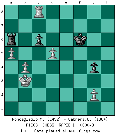 Last move : 1-0 2010 July 16 1:25:49 [Event "FICGS__CHESS__RAPID_D__000043"] [Site "FICGS"] [Date "2010.06.20"] [Round "1"] [White "Roncagliolo,Marco"] [Black "Cabrera,Claudio"] [Result "1-0"] [WhiteElo "1492"] [BlackElo "1384"] 1.e4 e6 2.d4 d5 3.Nd2 c5 4.exd5 exd5 5.Bb5+ Nc6 6.Qe2+ Qe7 7.Ndf3 Bg4 8.Qxe7+ Ngxe7 9.dxc5 Ng6 10.h3 Bd7 11.Be3 Rc8 12.O-O-O Nge7 13.Ne2 a6 14.Bxc6 Bxc6 15.Ned4 Ng6 16.Nxc6 bxc6 17.Rhe1 Be7 18.Nd4 O-O 19.Nf5 Bf6 20.Bd4 Bxd4 21.Nxd4 Nf4 22.Rg1 Rfe8 23.Kd2 Ne6 24.Nxe6 Rxe6 25.Rge1 Rf6 26.Re2 Kf8 27.Rde1 g6 28.f3 Rb8 29.Kc3 Rf4 30.b3 Rb5 31.Re8+ Kg7 32.Ra8 Rxc5+ 33.Kb2 a5 34.Re7 h5 35.Rea7 Rb4 36.Rxa5 Rcb5 37.Rxb5 Rxb5 38.a4 Rb7 39.Rc8 Rb6 40.c3 g5 41.b4 f5 42.Kb3 g4 43.a5 Ra6 44.fxg4 hxg4 45.hxg4 fxg4 46.c4 Kf6 47.cxd5 1-0 French : Tarrasch, Open, 4.ed ed Queenside Castling by player White (move 12) Kingside Castling by player Black (move 18) 10 pieces endgame at move 47 : White KRPPPP , Black KRPP WHITE : King + 1 Rook 4 Pawns BLACK : King + 1 Rook 2 Pawns Player White won this chess game. Follow this game move after move (download)Methodical thinking is of more use in Chess than inspiration. (C. J. S. Purdy) Schach wird sich dank seiner hohen kulturellen Tradition immer durchsetzen. In näherer Zukunft womöglich sogar als Gegenreaktion auf die maßlose Reizüberflutung im Freizeit- und Spielbereich. (Garry Kasparov) a manera como él juega al Ajedrez, demuestra la completa naturaleza de un hombre. (Stanley Ellin) Je fais ceci parce que dans cinquante coups j'obtiendrai cela; je m'appelle Mikhail Moisevitch Botvinnik. (Botvinnik) In fact if nothing is done against this teddy bear, hereby I announce that I would quit chess, rapid chess, blitz chess, postal chess, email chess, server chess and correspondence chess I will then switch to a table game where teddy bears aren't going to be seen for a while, like Poker, or Roulette, all 18+ games. (Elmer Valderrama)