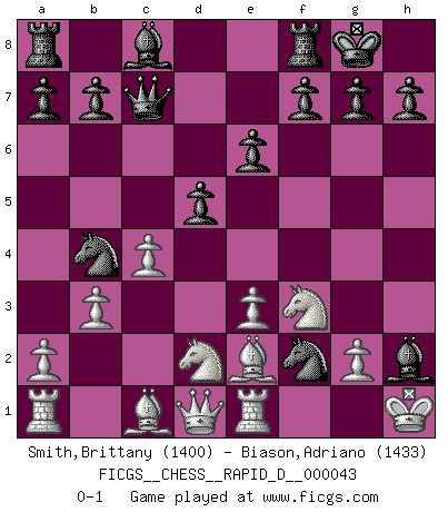 Last move : 0-1 2010 August 3 13:28:22 [Event "FICGS__CHESS__RAPID_D__000043"] [Site "FICGS"] [Date "2010.06.20"] [Round "1"] [White "Smith,Brittany"] [Black "Biason,Adriano"] [Result "0-1"] [WhiteElo "1400"] [BlackElo "1433"] 1.d4 Nf6 2.Nf3 e6 3.c3 d5 4.Nbd2 c5 5.c4 cxd4 6.Nfxd4 Nc6 7.e3 Qb6 8.Nd4f3 Bd6 9.Bd3 O-O 10.O-O Nb4 11.Be2 Qc7 12.b3 Ng4 13.Re1 Bxh2+ 14.Kh1 Nxf2+ 0-1 Queen's pawn game Kingside Castling by player Black (move 9) Kingside Castling by player White (move 10) Player Black won this chess game. Follow this game move after move (download)No one ever won a game by resigning. (Unknown) Ich bin Weltmeister und muß mit niemandem irgend etwas diskutieren. (Viswanathan Anand) Las ideas audaces son como las piezas del Ajedrez que avanzan hacia adelante. Ellas pueden ser vencidas, pero también pueden iniciar una partida victoriosa. (Goethe) Les Echecs ne sont pas pour les âmes timides. Ils requièrent un homme entier, qui ne s'arrête pas aveuglément à ce qui a été déjà établi, mais qui tente individuellement de sonder les profondeurs du jeu. (W. Steinitz) Your best chance to get a Royal Flush in a casino is in the bathroom. (Anonymous)