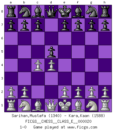 Last move : 1-0 2007 January 7 22:46:51 [Event "FICGS__CHESS__CLASS_E__000020"] [Site "FICGS"] [Date "2006.11.05"] [Round "1"] [White "Sarihan,Mustafa"] [Black "Kara,Kaan"] [Result "1-0"] [WhiteElo "1340"] [BlackElo "1588"] 1.d4 d5 2.c4 1-0 This chess game has been lost on time (started : 2006.11.05 3:50:18) Queen's Gambit Player White won this chess game. Follow this game move after move (download)Becoming successful at Chess allows you to discover your own personality. That's what I want for the kids I teach. (Saudin Robovic) Die unerbitterlichsten Regeln im Schach sind die Ausnahmen. (Savielly Grigorievitsch Tartakower) Sin errores no puede haber brillantez. (Emanuel Lasker) Le temps de noter son nom sur la feuille de partie, j'étais déjà en zeitnot ! D'un modeste amateur apparié lors de la première ronde d'un open contre le grand-maître Azmaïparashvili. Creativity involves breaking out of established patterns in order to look at things in a different way. (Edward De Bono)