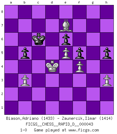 Last move : 1-0 2010 October 15 9:47:56 [Event "FICGS__CHESS__RAPID_D__000043"] [Site "FICGS"] [Date "2010.06.20"] [Round "1"] [White "Biason,Adriano"] [Black "Zaunercik,Ilmar"] [Result "1-0"] [WhiteElo "1433"] [BlackElo "1414"] 1.d4 d5 2.c4 e6 3.Nf3 Nf6 4.Nbd2 Be7 5.g3 O-O 6.Bg2 Nbd7 7.O-O c6 8.Qc2 Qc7 9.e4 dxe4 10.Nxe4 b6 11.Bf4 Qd8 12.Ne5 Nxe5 13.Nxf6+ Bxf6 14.dxe5 Be7 15.Bxc6 Rb8 16.Rad1 Qc7 17.Ba4 g5 18.Be3 Ba6 19.Rd7 Qxc4 20.Qxc4 Bxc4 21.Rc1 Bc5 22.Bxc5 Rfc8 23.Bd6 Ra8 24.b3 Bd5 25.R1c7 Rxc7 26.Rxc7 Rd8 27.Bc6 Bxc6 28.Rxc6 Rd7 29.Rc7 Rxc7 30.Bxc7 Kf8 31.a4 Ke7 32.Bb8 a6 33.Bc7 b5 34.axb5 axb5 35.f4 gxf4 36.gxf4 Kd7 37.Bd6 Kc6 38.Kf2 Kd5 39.Ke3 h5 40.h3 f6 41.Kd3 f5 42.Be7 Kc6 43.Kd4 1-0 This chess game has been lost on time (started : 2010.06.20 14:17:0) Queen's gambit declined Kingside Castling by player Black (move 5) Kingside Castling by player White (move 7) Player White won this chess game. Follow this game move after move (download)Chess is life. (Bobby Fischer) Immer nach dem besten Zug zu suchen ist ziemlich unpraktisch. (Nigel Short) Yo nunca en mi vida he jugado la Defensa Francesa, que viene siendo la más aburrida de todas las Aperturas. (Wilhelm Steinitz) Fischer est le meilleur joueur du monde et Karpov n'est qu'un joueur de bistrot. (Garry Kasparov, agé de 16 ans) This is where the fun begins. (Anakin Skywalker in Star Wars ep.3)