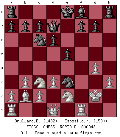 Last move : 0-1 2010 July 1 10:42:56 [Event "FICGS__CHESS__RAPID_D__000043"] [Site "FICGS"] [Date "2010.06.20"] [Round "1"] [White "Brulland,Emmanuel"] [Black "Esposito,Marco"] [Result "0-1"] [WhiteElo "1432"] [BlackElo "1500"] 1.b3 d6 2.Bb2 e5 3.g3 Nf6 4.Bg2 Nc6 5.e3 Bg4 6.Ne2 Qd7 7.h3 Bh5 8.g4 Bg6 9.O-O h5 10.f3 hxg4 11.fxg4 Be4 12.d3 Bxg2 13.Kxg2 Nd5 14.Nbc3 Nxe3+ 0-1 Nimzovich-Larsen attack Kingside Castling by player White (move 9) Player Black won this chess game. Follow this game move after move (download)All I want to do, ever, is just play Chess. (Bobby Fischer) Man wirke der falschen Auffassung entgegen, als ob jeder Zug Unmittelbares zu leisten habe; auch Werte- und Ruhezüge haben ihre Existenzberechtigung. (Aaron Nimzowitsch) Peones: ellos son el alma de esta partida, solos forman el ataque y la defensa. (Philidor) Roi des jeux et jeu des rois, les échecs portent en eux un sentiment d'infini. Ils donnent à celui qui s'est efforcé d'en approfondir les arcanes l'impression de n'être pas à la mesure de l'homme; en fait, ils constituent un résumé de l'univers, un microcosme, et figurent cette grande échelle qui, dans les plans de la lumière descend jusqu'à la matière, qui des abîmes insondables remonte jusqu'en l'infini de Dieu. (Pyrame) You must have a dream in order to have it come true. (A.P.J. Kalam)
