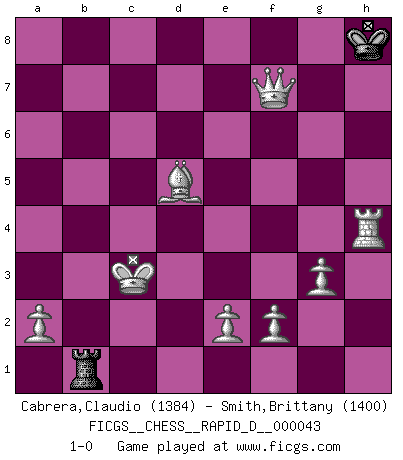 Last move : 1-0 2010 July 6 21:30:45 [Event "FICGS__CHESS__RAPID_D__000043"] [Site "FICGS"] [Date "2010.06.20"] [Round "1"] [White "Cabrera,Claudio"] [Black "Smith,Brittany"] [Result "1-0"] [WhiteElo "1384"] [BlackElo "1400"] 1.d4 d5 2.c4 e6 3.g3 Na6 4.Bg2 c6 5.cxd5 cxd5 6.Nf3 Qd6 7.Nc3 Qd7 8.Ne5 Qc7 9.Bf4 g6 10.Nxg6 hxg6 11.Bxc7 Nxc7 12.Qa4+ Bd7 13.Qb3 Nf6 14.Qxb7 Bg7 15.Qxc7 O-O 16.h4 Rac8 17.Qxa7 Bc6 18.Rc1 Rcd8 19.b4 Nd7 20.b5 Rdc8 21.bxc6 Rxc6 22.Qxd7 Rca6 23.h5 gxh5 24.Rxh5 Bxd4 25.Nxd5 exd5 26.Rg5+ Kh7 27.Qh3+ Rah6 28.Rh5 Rxh5 29.Qxh5+ Kg8 30.Bxd5 Bc3+ 31.Rxc3 Rb8 32.Rc4 Rb1+ 33.Kd2 Rb2+ 34.Kc3 Rb1 35.Qxf7+ Kh8 36.Rh4+ 1-0 Queen's gambit declined Kingside Castling by player Black (move 15) 10 pieces endgame at move 35 : White KQRBPPPP , Black KR WHITE : King + 1 Queen 1 Rook 1 Bishop 4 Pawns BLACK : King + 1 Rook Player White won this chess game. Follow this game move after move (download)Chess is a terrible game. If you have no center, your opponent has a freer position. If you do have a center, then you really have something to worry about ! (Siegbert Tarrasch) Ein guter Spieler hat immer Glück. (José Raúl Capablanca) Me dio la sensación de como si yo estuviera jugando en contra del mismo Ajedrez. - al estar jugando en contra de Robert Fischer (Walter Shipman) Aux échecs, les retours au sommet sont rares : les dommages psychologiques consécutifs à une défaite sont trop sévères. (Daily Telegraph) There are lots of people who mistake their imagination for their memory. (Josh Bilings)
