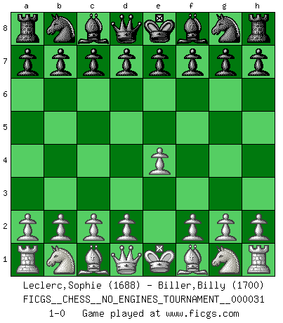 Last move : 1-0 2010 July 31 9:52:54 [Event "FICGS__CHESS__NO_ENGINES_TOURNAMENT__000031"] [Site "FICGS"] [Date "2010.06.20"] [Round "1"] [White "Leclerc,Sophie"] [Black "Biller,Billy"] [Result "1-0"] [WhiteElo "1688"] [BlackElo "1700"] 1.e4 1-0 This chess game has been lost on time (started : 2010.06.20 14:18:12) King's pawn Opening Player White won this chess game. Follow this game move after move (download)A Chess game is a dialogue, a conversation between a player and his opponent. Each move by the opponent may contain threats or be a blunder, but a player cannot defend against threats or take advantage of blunders if he does not first ask himself: What is my opponent planning after each move ? (Bruce A. Moon) Ich moechte nie einem Club beitreten, der Leute wie mich als Mitglieder aufnimmt. (Woody Allen) Preferería tener un Peón que un dedo. (Reuben Fine) Comme les marins qui ont mille raisons différentes d'aller en mer, les joueurs d'échecs en ont tout autant avant de s'installer devant une table et jouer... (Vincent Bertignac, philosophe) A woman without a man is like a fish without a bicycle. (Gloria Steinem)