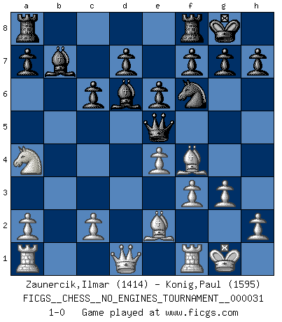Last move : 1-0 2010 July 11 10:6:58 [Event "FICGS__CHESS__NO_ENGINES_TOURNAMENT__000031"] [Site "FICGS"] [Date "2010.06.20"] [Round "1"] [White "Zaunercik,Ilmar"] [Black "Konig,Paul"] [Result "1-0"] [WhiteElo "1414"] [BlackElo "1595"] 1.e4 c5 2.Nf3 Nc6 3.d4 cxd4 4.Nxd4 Nf6 5.Nc3 Qb6 6.Nxc6 bxc6 7.Be2 Bb7 8.O-O e6 9.Be3 Qxb2 10.Na4 Qe5 11.f3 Bd6 12.g3 O-O 13.Bf4 1-0 Sicilian defense Kingside Castling by player White (move 8) Kingside Castling by player Black (move 12) Player White won this chess game. Follow this game move after move (download)He who fears an isolated Queen's Pawn should give up Chess. (Siegbert Tarrasch) Wie, soll nun auch die Opposition abgeschafft werden? Ja, es tut mir leid, Ihnen diesen Schmerz nicht ersparen zu können. (Aaron Nimzowitsch) Las combinaciones han sido siempre el aspecto más intrigante del Ajedrez. Los Maestros las buscan, el público las aplauden, los críticos las alaban. La razón se debe a que las combinaciones hacen posible que el Ajedrez sea más que un ejercicio matemático con una carencia de vida. Ellas son la poesía del juego, son del Ajedrez lo que la melodía es de la música. Ellas representan el triunfo de la mente sobre la materia. (Reuben Fine) La solitude du joueur d'Echecs à l'approche du mat est semblable à celle du condamné. (Francis Szpiner) Just because you do not take an interest in politics doesn't mean politics won't take an interest in you. (Pericles 430 B.C.)