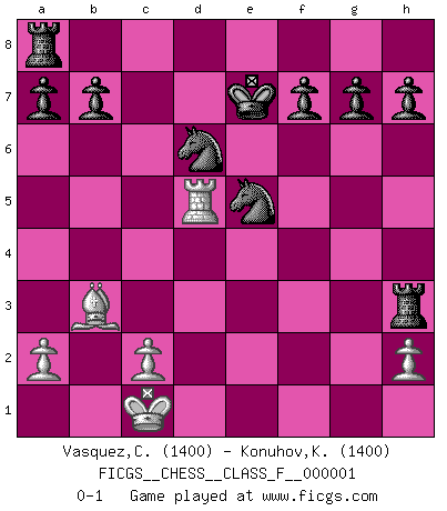 Last move : 0-1 2006 June 18 12:41:43 [Event "FICGS__CHESS__CLASS_F__000001"] [Site "FICGS"] [Date "2006.04.28"] [Round "1"] [White "Vasquez,Carlos"] [Black "Konuhov,Konstantin"] [Result "0-1"] [WhiteElo "1400"] [BlackElo "1400"] 1.e4 c5 2.Nf3 Nc6 3.Bc4 e6 4.d4 d5 5.exd5 exd5 6.Bb5 Bg4 7.dxc5 Bxc5 8.Qd3 Qe7+ 9.Be3 Bxf3 10.gxf3 d4 11.Qe4 Qxe4 12.fxe4 dxe3 13.fxe3 Bxe3 14.Nc3 Bd4 15.O-O-O Bxc3 16.bxc3 Nf6 17.Rd6 Ke7 18.Rhd1 Ne5 19.R1d4 Rhc8 20.Ba4 Rxc3 21.Bb3 Rh3 22.Rd2 Nxe4 23.R2d5 Nxd6 0-1 Sicilian defense Queenside Castling by player White (move 15) Player Black won this chess game. Follow this game move after move (download)For me, Chess is life and every game is like a new life. Every Chess player gets to live many lives in one lifetime. (Eduard Gufeld) Spielt Blackmar-Diemer-Gambit, und das Matt kommt von selbst! (Emil Joseph Diemer) No hay otro maestro que tenga una voluntad terrífica de ganar. Al tablero, el irradía peligro y aún los oponentes mas fuertes tienden a congelarse como liebres cuando olfatean a una pantera. Aún sus debilidades son peligrosas. Con las blancas, su juego de apertura es predecible - te es posible hacer planes en su contra - pero es tan fuerte que tus planes casi nunca funcionan. En el juego medio, su precisión e invención son fabulosas y en finales, tú simplemente no le puedes vencer. (Experto Alemán anónimo) Le plus grand jeu de l'esprit jamais inventé, plus vous l'apprenez, plus vous y prenez du plaisir. (Garry Kasparov) If you are good, you will be assigned all the work. If you are really good, you will get out of it. (Dan Rotaru)