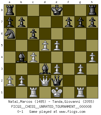Last move : 0-1 2010 August 10 11:24:50 [Event "FICGS__CHESS__UNRATED_TOURNAMENT__000008"] [Site "FICGS"] [Date "2010.06.20"] [Round "1"] [White "Natal,Marcos"] [Black "Tanda,Giovanni"] [Result "0-1"] [WhiteElo "1485"] [BlackElo "2055"] 1.d4 d5 2.c4 c6 3.Nc3 Nf6 4.Bg5 Ne4 5.Nxe4 dxe4 6.e3 Qa5+ 7.Qd2 Qxg5 8.g3 e5 9.d5 Bg4 10.Bg2 Na6 11.Bxe4 Bb4 12.Nf3 Bxf3 13.Rg1 Bxe4 14.f4 Qh5 15.h4 Qf3 16.fxe5 Bd3 17.Rc1 Qe2+ 0-1 QGD Slav defense Player Black won this chess game. Follow this game move after move (download)Why must I lose to this idiot ? (Aron Nimzovich) Wenn Capablanka heute auf der Schachbühne erscheinen würde, hätte er ein halbes Jahr gebraucht um sich die Schachtheorie anzueignen. Und dann hätte er alles und jeden besiegt. (Mikhail Moiseyevich Botvinik) No puedes jugar al Ajedrez si eres de corazón noble. (Proverbio Francés) Je ne crois pas en la psychologie, je crois aux bons coups. (Robert Fischer) Life doesn't imitate art, it imitates bad television. (Woody Allen)