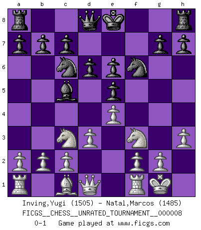 Last move : 0-1 2010 July 31 21:59:24 [Event "FICGS__CHESS__UNRATED_TOURNAMENT__000008"] [Site "FICGS"] [Date "2010.06.20"] [Round "1"] [White "Inving,Yugi"] [Black "Natal,Marcos"] [Result "0-1"] [WhiteElo "1505"] [BlackElo "1485"] 1.e4 e5 2.Nf3 Nc6 3.Bc4 Nf6 4.d3 Bc5 5.Nc3 d6 6.O-O Bg4 7.h3 Be6 8.Bxe6 fxe6 0-1 This chess game has been lost on time (started : 2010.06.20 18:38:20) Two knights defense (Modern Bishop's Opening) Kingside Castling by player White (move 6) Player Black won this chess game. Follow this game move after move (download)When I asked Fischer why he had not played a certain move in our game, he replied: 'Well, you laughed when I wrote it down !' (Mikhail Tal) Ich spiele ehrlich und spiele, um zu gewinnen. Wenn ich verliere nehme ich meine Medizin. (Robert James Fischer) El Ajedrez detiene a su maestro dentro de sus propios vínculos, encadenando la mente y el cerebro, por lo que la libertad interior del mas fuerte debe sufrir. (Albert Einstein) J'ai vu le vaincu d'Echecs jouer des années durant dans l'espoir de la fête de la victoire. Car tu es plus riche de ce qu'elle existe si même elle n'est point pour toi. Ainsi de la perle du fond des mers. (Antoine de Saint-Exupéry) Computers make it easier to do a lot of things, but most of the things they make it easier to do don't need to be done. (Andy Rooney)