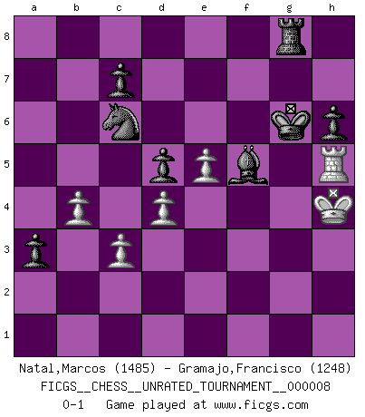Last move : 0-1 2010 July 28 12:39:56 [Event "FICGS__CHESS__UNRATED_TOURNAMENT__000008"] [Site "FICGS"] [Date "2010.06.20"] [Round "1"] [White "Natal,Marcos"] [Black "Gramajo,Francisco"] [Result "0-1"] [WhiteElo "1485"] [BlackElo "1248"] 1.d4 Nc6 2.e4 Nf6 3.e5 Nd5 4.Bc4 Ndb4 5.a3 Na6 6.Bxa6 bxa6 7.Nf3 e6 8.Be3 Rb8 9.b4 d5 10.O-O a5 11.c3 axb4 12.axb4 Be7 13.Nbd2 O-O 14.Qc2 h6 15.h3 f5 16.Nh2 f4 17.Bxf4 Rxf4 18.g3 Rf5 19.Ndf3 Qf8 20.Ng4 Rxf3 21.Qg6 Bg5 22.h4 Rf5 23.hxg5 Kh8 24.Kg2 Rxg5 25.Qxg5 hxg5 26.Rh1+ Kg8 27.Rh5 Qf7 28.Rah1 Kf8 29.Rxg5 Ba6 30.Rh8+ Ke7 31.Rh7 Rg8 32.Nh6 gxh6 33.Rxf7+ Kxf7 34.Rh5 Kg6 35.g4 Bd3 36.f4 a5 37.Kh3 a4 38.Kh4 a3 39.f5+ exf5 40.gxf5+ Bxf5 0-1 Queen's pawn : Lundin (Kevitz-Mikenas) defense Kingside Castling by player White (move 10) Kingside Castling by player Black (move 13) Player Black won this chess game. Follow this game move after move (download)Good positions don't win games, good moves do. (Gerald Abrahams) Wie ich sie so einen nach dem anderen nieder mähte wurde meine Überlegenheit offensichtlich. (José Raúl Capablanca) Algunos sacrificios son sólidos, los demás son míos. (Mikhail Tal) Il vaut mieux sacrifier les pièces de l'adversaire. (Xavier Tartacover) Statistics can be made to prove anything - even the truth. (Author unknown)