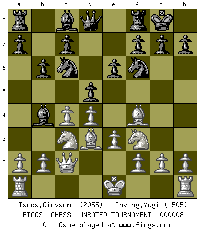 Last move : 1-0 2010 August 5 10:12:11 [Event "FICGS__CHESS__UNRATED_TOURNAMENT__000008"] [Site "FICGS"] [Date "2010.06.20"] [Round "1"] [White "Tanda,Giovanni"] [Black "Inving,Yugi"] [Result "1-0"] [WhiteElo "2055"] [BlackElo "1505"] 1.d4 d5 2.Bf4 Nf6 3.e3 Nc6 4.c4 e6 5.Nc3 Bb4 6.Qc2 O-O 7.Nf3 b6 8.Bd3 1-0 This chess game has been lost on time (started : 2010.06.20 18:38:20) Queen's pawn, Mason variation Kingside Castling by player Black (move 6) Player White won this chess game. Follow this game move after move (download)By playing at Chess then, we may learn: First: Foresight... Second: Circumspection... Third: Caution... And lastly, we learn by Chess the habit of not being discouraged by present bad appearances in the state of our affairs, the habit of hoping for a favorable chance, and that of persevering in the secrets of resources. (Benjamin Franklin) Ein Großmeister muß tausende Partien in seinem Kopf speichern, denn diese sind für Ihn, was die Worte der Muttersprache für gewöhnliche Leute sind, oder Noten für Musiker... (Garry Kasparov) Debes de llevar a tu oponente hacia un profundo y obscuro bosque donde 2+2=5, y el camino que conduce a la salida es suficientemente ancho para solamente uno. (Mikhail Tal) Shah mat. Le roi est mort. Cri de fierté d'un joueur venant de terrasser son adversaire, courtoisement, sans effusion de sang. Good luck. You're gonna need it. (Han Solo in Star Wars ep.6)