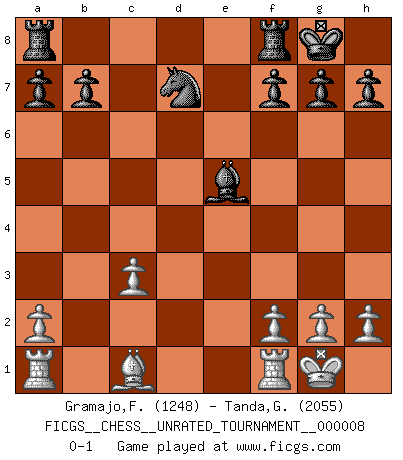 Last move : 0-1 2010 August 25 20:37:4 [Event "FICGS__CHESS__UNRATED_TOURNAMENT__000008"] [Site "FICGS"] [Date "2010.06.20"] [Round "1"] [White "Gramajo,Francisco"] [Black "Tanda,Giovanni"] [Result "0-1"] [WhiteElo "1248"] [BlackElo "2055"] 1.Nf3 d5 2.e3 Nf6 3.c4 c6 4.cxd5 cxd5 5.d4 Nc6 6.Bb5 e6 7.Ne5 Bd7 8.Qf3 Nxe5 9.Bxd7+ Nexd7 10.Nc3 Bd6 11.Nb5 Qa5+ 12.Nc3 Ne4 13.O-O Nxc3 14.bxc3 O-O 15.e4 dxe4 16.Qxe4 Qd5 17.Qe3 e5 18.dxe5 Qxe5 19.Qxe5 Bxe5 0-1 Reti Opening Kingside Castling by player White (move 13) Kingside Castling by player Black (move 14) Player Black won this chess game. Follow this game move after move (download)A chess genius has died; a loss for humanity. (Viktor Kortchnoi, about Bobby Fischer's death) Ich habe die besten Aussichten, den ersten Preis zu gewinnen - denn jeder muss gegen Steinitz spielen, nur ich nicht! (Wilhelm Steinitz) Todavía soy una víctima del Ajedrez. Tiene toda la belleza del arte y mucho mas. No puede ser comercializado. El Ajedrez es mas puro que el arte en su posición social. (Marcel Duchamp) J'apprécie les joueurs d'est-indienne, c'est grâce à eux que je nourris ma famille depuis tant d'années. (Petrosian) He who defends everything defends nothing. (Frederick the Great)