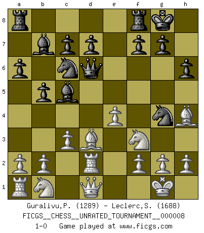 Last move : 1-0 2010 September 5 23:17:36 [Event "FICGS__CHESS__UNRATED_TOURNAMENT__000008"] [Site "FICGS"] [Date "2010.06.20"] [Round "1"] [White "Guralivu,Paul-Iosif"] [Black "Leclerc,Sophie"] [Result "1-0"] [WhiteElo "1289"] [BlackElo "1688"] 1.e4 e5 2.Nf3 Nc6 3.Bb5 a6 4.Ba4 Bc5 5.O-O b5 6.Bb3 Nf6 7.c3 O-O 8.Re1 Bb7 9.Bc2 Ng4 10.d4 exd4 11.Re2 Qf6 12.Bg5 Qd6 13.Rd2 d3 14.Bxd3 h6 15.Bh4 1-0 Ruy Lopez : Classical defense deferred Kingside Castling by player White (move 5) Kingside Castling by player Black (move 7) Player White won this chess game. Follow this game move after move (download)The older I grow, the more I value Pawns. (Keres) Bobby Fischer ist kein Vorbild für die heutige Jugend. (Viktor Kortschnoi) El Ajedrez, como la música, como el amor, tiene el poder de hacer feliz a la gente. (Siegbert Tarrasch) Les pièces de l'échiquier étaient impitoyables. Elles le retenaient, elles l'absorbaient. Il y avait de l'horreur en cela, mais aussi une harmonie unique. Car, qu'y a-t-il dans le monde, à part les échecs ? (V. Nabokov) Thus, what is of supreme importance in war is to attack the enemy's strategy. (Sun Tzu)