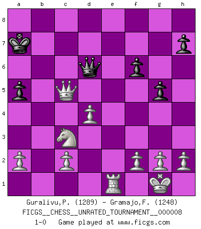 Last move : 1-0 2010 July 14 22:31:47 [Event "FICGS__CHESS__UNRATED_TOURNAMENT__000008"] [Site "FICGS"] [Date "2010.06.20"] [Round "1"] [White "Guralivu,Paul-Iosif"] [Black "Gramajo,Francisco"] [Result "1-0"] [WhiteElo "1289"] [BlackElo "1248"] 1.e4 e5 2.Nf3 Nc6 3.Bb5 a6 4.Ba4 Nf6 5.O-O Nxe4 6.Re1 d5 7.d3 Nc5 8.Bxc6+ bxc6 9.Nxe5 Be6 10.Nxc6 Qd6 11.Ne5 f6 12.Qh5+ Kd8 13.Nf7+ Bxf7 14.Qxf7 Kc8 15.Nc3 Kb7 16.Nxd5 Rd8 17.Nc3 Rd7 18.Qc4 Re7 19.Bf4 Qc6 20.Rxe7 Bxe7 21.Re1 g5 22.Bxc7 Bd6 23.Bxd6 Qxd6 24.b4 Rc8 25.bxc5 Rxc5 26.Qb4+ Ka7 27.d4 a5 28.Qxc5+ 1-0 Ruy Lopez : Open (Tarrasch) defense Kingside Castling by player White (move 5) Player White won this chess game. Follow this game move after move (download)Chess is really ninety nine percent calculation. (Soltis) Das typische an einem Großmeister ist, daß er eine gewonnene Position schnell und schmerzlos gewinnt. (Irving Chernev) No es una movida, aún la mejor movida que tu debas buscar, sino un plan comprensible. (Eugene Znosko-Borovsky) Il s'avisa de me proposer d'apprendre les échecs qu'il jouait un peu... me voilà forcené des échecs. J'achète un échiquier, je m'enferme dans ma chambre, j'y passe des jours et des nuits à vouloir apprendre par cur toutes les parties. (Jean-Jacques Rousseau, Confessions) Watch your thoughts; they become words. Watch your words; they become actions. Watch your actions; they become habits. Watch your habits; they become character. Watch your character; it becomes your destiny. (Frank Outlaw)