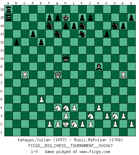 Last move : 1-0 2010 October 9 21:31:5 [Event "FICGS__BIG_CHESS__TOURNAMENT__000067"] [Site "FICGS"] [Date "2010.06.21"] [Round "1"] [White "Kehayov,Yulian"] [Black "Rusli,Rafnizar"] [Result "1-0"] [WhiteElo "1497"] [BlackElo "1706"] 1.j2-k4 j15-k13 2.n2-n3 h16-o10 3.h2-g4 o10-j10 4.m2-m4 e15-e13 5.h1-o7 h15-g13 6.e2-e4 f16-b12 7.l1-m2 m15-m13 8.k4-m5 a15-a13 9.d2-d4 d15-d13 10.b2-b3 n15-n13 11.m2-b12 a13-b12 12.m1-m3 c16-h11 13.f1-c4 j10-j6 14.m3-k3 j6-d6 15.e4-e5 d6-d4 16.c2-c3 d4-c5 17.o7-o15 p16-o14 18.c4-m13 m16-m13 19.o1-g8 m13-m5 20.o15-k11 g16-f14 21.c1-e3 c5-c10 22.p1-o3 h11-e8 23.j3-j4 k16-h15 24.b1-d2 b16-c14 25.d2-f3 c10-c3 26.e1-c1 c3-b2 27.k1-l3 m5-m12 28.j1-h2 a16-a2 29.g1-j2 e16-a16 30.a1-b1 b2-a3 31.b3-b4 a16-a11 32.k11-j10 a2-b2 33.b1-b2 a3-b2 34.j10-c16 j16-j15 35.c16-l16 h15-k14 36.l16-c16 a11-a15 37.c16-c15 o16-g9 38.e3-k8 m12-e12 39.g8-b13 q16-a16 40.b13-c14 b15-c14 41.c15-c14 b2-b4 42.c14-c2 e12-c12 43.c2-j8 c12-c1 44.q1-c1 g9-h10 45.k8-h10 b4-h10 46.k3-k8 e8-j12 47.c1-c8 e13-e12 48.k8-p8 j12-m9 49.j8-g8 p15-p14 50.p2-p3 j15-h15 51.f3-h4 1-0 This big chess game has been lost on time (started : 2010.06.21 13:33:33) Follow this game move after move (download)No price is too great for the scalp of the enemy King. (Koblentz) Zu meiner Zeit war ein 20 jähriger ein junger Spieler, heute ist er ein Veteran. (Garry Kasparov) En partidas rápidas, el Caballo es mas poderoso que el Alfil. (Vlastimil Hort) Je menace de comprendre la position. (Anonyme) Philosophers use a language that is already deformed as though by shoes that are too tight. (Ludwig Wittgenstein)