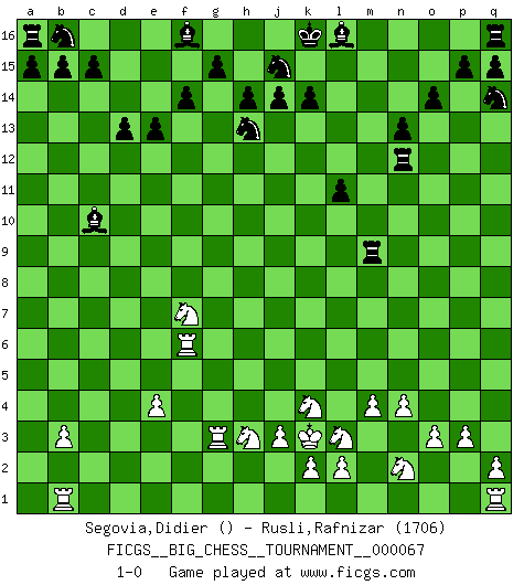Last move : 1-0 2010 October 11 9:40:53 [Event "FICGS__BIG_CHESS__TOURNAMENT__000067"] [Site "FICGS"] [Date "2010.06.21"] [Round "1"] [White "Segovia,Didier"] [Black "Rusli,Rafnizar"] [Result "1-0"] [WhiteElo ""] [BlackElo "1706"] 1.j2-k4 j15-h13 2.n2-n3 m15-m13 3.o1-d11 h16-p9 4.p2-p3 p9-p11 5.h1-l4 k16-l14 6.d11-f9 p11-f2 7.h2-f3 n15-n13 8.f9-l14 k15-l14 9.l4-l14 j16-k16 10.b2-b3 e15-e13 11.d2-d3 o16-j11 12.c1-p13 o15-o14 13.p13-n11 m13-m12 14.n11-g5 j11-m8 15.h3-h4 d15-d13 16.g1-h3 f2-a7 17.e2-e4 a7-c7 18.g5-f4 c7-c2 19.b1-a3 c2-c14 20.e1-c1 c14-a14 21.f4-c7 h15-k14 22.d3-d4 a14-a3 23.m2-m4 a3-g9 24.f3-g5 c16-f13 25.f1-a6 g16-j15 26.l14-n12 g9-j7 27.c7-k14 l15-k14 28.c1-f1 f13-e12 29.o2-o3 f15-f14 30.n3-n4 m8-h4 31.g5-f3 h4-g3 32.j1-j2 p16-q14 33.f3-g5 j7-a7 34.a6-c4 a7-d4 35.a1-d1 d4-a7 36.c4-k11 a7-a2 37.k11-m9 a2-g2 38.j2-k3 g2-b2 39.l1-q6 e16-e14 40.d1-b1 b2-l11 41.q6-l11 m12-l11 42.f1-f6 m16-m9 43.p1-n2 e14-b14 44.k1-l3 b14-b12 45.m1-g1 e12-c10 46.g5-f7 b12-n12 47.g1-g3 1-0 This big chess game has been lost on time (started : 2010.06.21 13:33:33) Follow this game move after move (download)By the beauty of his games, the clarity of his play, and the brilliance of his ideas, Fischer made himself an artist of the same stature as Brahms, Rembrandt, and Shakespeare. (David Levy) Ohne Leiden bildet sich kein Charakter. (Ernst Freiherr von Feuchtersleben) Todavía soy una víctima del Ajedrez. Tiene toda la belleza del arte y mucho mas. No puede ser comercializado. El Ajedrez es mas puro que el arte en su posición social. (Marcel Duchamp) Il vaut mieux sacrifier les pièces de l'adversaire. (Xavier Tartacover) Follow your passion, and success will follow you. (Arthur Buddhold)