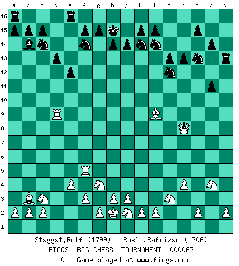 Last move : 1-0 2010 October 2 21:20:53 [Event "FICGS__BIG_CHESS__TOURNAMENT__000067"] [Site "FICGS"] [Date "2010.06.21"] [Round "1"] [White "Staggat,Rolf"] [Black "Rusli,Rafnizar"] [Result "1-0"] [WhiteElo "1799"] [BlackElo "1706"] 1.j2-k4 j15-h13 2.h2-g4 m15-m13 3.n2-n4 e15-e13 4.m2-m4 d15-d13 5.e2-e4 h16-o10 6.p1-o3 f16-b12 7.h1-l4 k16-l14 8.d2-d4 o10-j10 9.l1-p5 n15-n13 10.g1-j2 o16-f8 11.c1-l9 b16-c14 12.b1-c3 p16-q14 13.l4-p8 q16-p16 14.o1-g8 j10-j13 15.j1-h2 h15-k14 16.f1-c4 g16-f14 17.m1-m3 l16-p12 18.f2-f3 c16-l8 19.k1-l3 j13-b6 20.c4-b3 b6-d4 21.a1-d1 d4-h8 22.l3-k5 j16-j15 23.k5-m6 p12-n10 24.p8-m8 h8-h11 25.m6-l8 n10-l8 26.m3-l3 l8-p12 27.l3-l5 h13-k12 28.d1-d11 h11-f13 29.e1-d1 e13-e12 30.d11-d5 k12-h13 31.l5-f5 f13-p4 32.o3-m2 f8-g9 33.d5-d9 b12-c13 34.g8-j10 p4-p2 35.k4-m3 g9-m4 36.d1-p1 m4-k6 37.m8-o8 p2-q1 38.p1-q1 q14-o13 39.q1-p1 q15-q13 40.m2-l4 k6-h8 41.p5-n3 h8-n3 42.l4-n3 p15-p14 43.o8-q8 j15-h15 44.j10-l8 p16-q16 45.l8-p12 q13-p12 46.q8-c8 c13-b14 47.c8-k8 p12-p11 48.p1-p8 h13-k12 49.l9-p13 m16-f16 50.p8-q8 k12-l10 51.k8-n8 l10-m12 52.q8-q16 f16-q16 53.n3-p4 q16-q13 54.p13-l9 1-0 This big chess game has been lost on time (started : 2010.06.21 13:33:33) Follow this game move after move (download)You can only get good at Chess if you love the game. (Bobby Fischer) Schach ist ein Reich, wo sich die menschliche Phantasie frei entfalten kann. (David Bronstein) El Ajedrez lo es todo: arte, ciencia y deporte. (Anatoly Karpov) Aux échecs, l'amour-propre est satisfait quand on remporte la victoire, mais il n'y a pas de honte à être battu. (Benjamin Franklin) In theory there is no difference between theory and practice. In practice there is. (Yogi Berra)