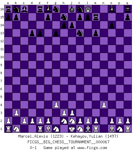 Last move : 0-1 2010 July 12 0:11:1 [Event "FICGS__BIG_CHESS__TOURNAMENT__000067"] [Site "FICGS"] [Date "2010.06.21"] [Round "1"] [White "Marcel,Alexis"] [Black "Kehayov,Yulian"] [Result "0-1"] [WhiteElo "1223"] [BlackElo "1497"] 1.g2-g4 j15-k13 2.h1-c6 m15-m13 3.c6-c15 g15-g13 4.n2-n4 h16-o10 5.c15-c12 o10-e10 6.c12-e10 e15-e13 7.e10-o10 n15-n14 8.o10-o15 p16-o14 9.b2-b3 m16-m15 10.o15-n14 m15-n15 11.n14-l16 n15-m15 12.c1-b2 d15-d13 13.b2-o14 p15-o14 0-1 Follow this game move after move (download)Avoid the crowd. Do your own thinking independently. Be the Chess player, not the Chess piece. (Ralph Charell) Deine Wertungszahl - vorausgesetzt einige Jahre schachliche Anstrengung - entspricht etwa dem zehnfachen Deines IQ plus 1000. (Jonathan Levitt) Todo lo que importa ante el tablero de Ajedrez son buenas jugadas. (Bobby Fischer) Il n'y a pas eu de défaite parce que je ne crois pas que cet ordinateur ait jamais existé. IBM a triché en refusant d'imprimer les modes de recherche de la machine. C'est évident, pendant le match, des coups décisifs ont été joués par des êtres humains. Aujourd'hui, les meilleurs spécialistes en informatique ne peuvent toujours pas expliquer comment Deep-Blue a pu jouer contre la logique des ordinateurs. IBM a gagné une guerre de communication, mais ils sont incapables de prouver que l'ordinateur a gagné tout seul. (Garry Kasparov) Life is like internet, nothing interesting, but noone want to leave it. (Ilmars Cirulis)